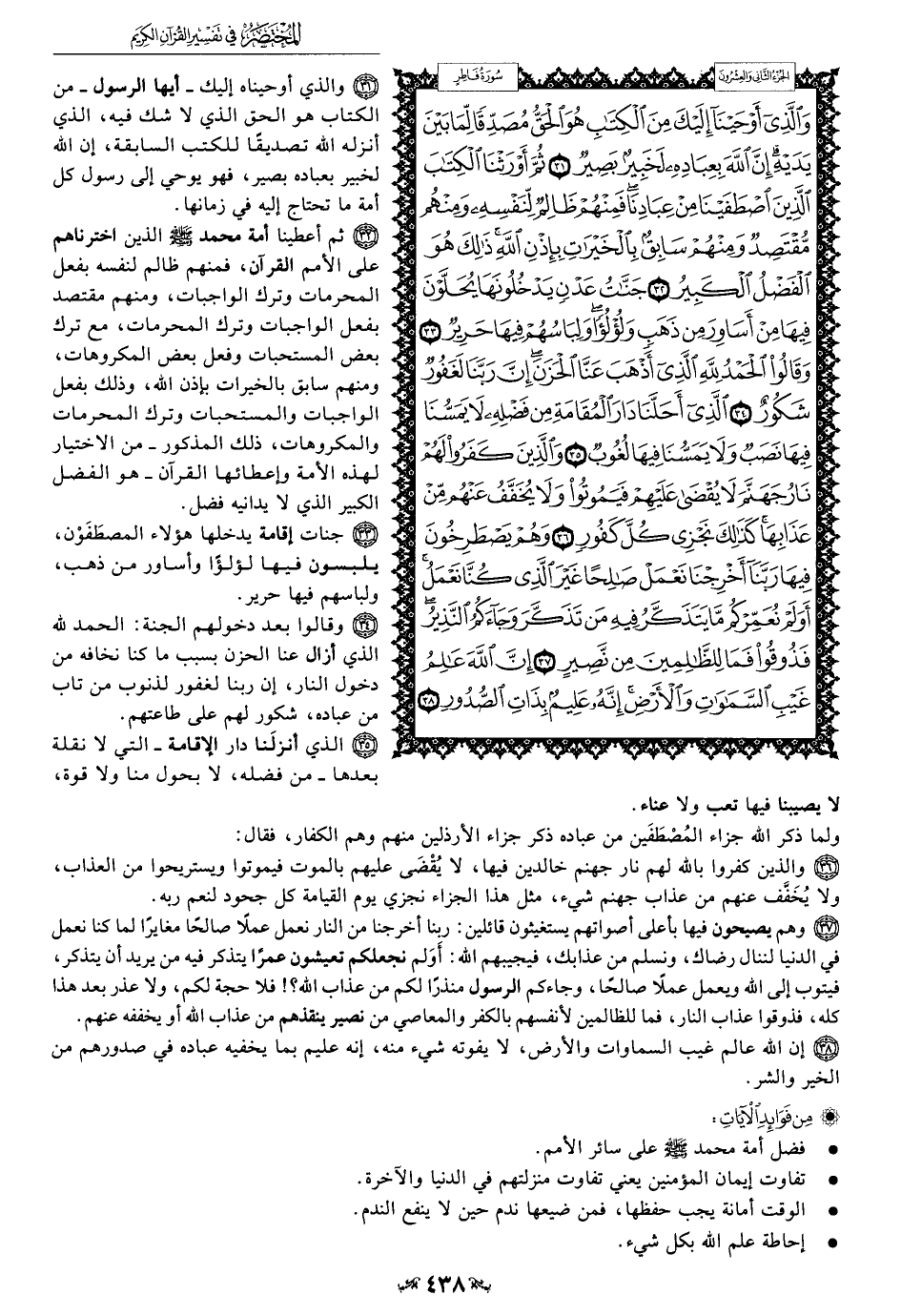32 - ثم أعطينا أمة محمد - صلى الله عليه وسلم - الذين اخترناهم على الأمم القرآن، فمنهم ظالم لنفسه بفعل المحرمات وترك الواجبات، ومنهم مقتصد بفعل الواجبات وترك المحرمات، مع ترك بعض المستحبات وفعل بعض المكروهات، ومنهم سابق بالخيرات بإذن الله، وذلك بفعل الواجبات والمستحبات وترك المحرمات والمكروهات، ذلك المذكور -من الاختيار لهذه الأمة وإعطائها القرآن- هو الفضل الكبير الذي لا يدانيه فضل.