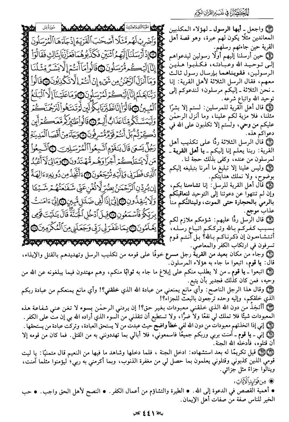 25 - إني -يا قوم- آمنت بربي وربكم جميعًا فاسمعوني، فلا أبالي بما تهددونني به من القتل. فما كان من قومه إلا أن قتلوه، فأدخله الله الجنة.