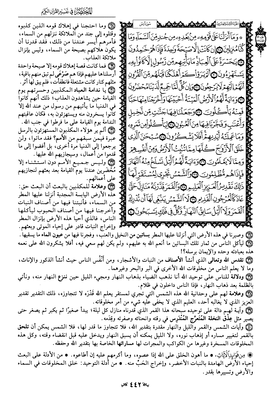 33 - وعلامة للمكذبين بالبعث أن البعث حق هذه الأرض اليابسة المجدبة أنزلنا عليها المطر من السماء، فأنبتنا فيها من أصناف النبات وأخرجنا فيها من أصناف الحبوب ليأكلها الناس، فالذي أحيا هذه الأرض بإنزال المطر وإخراج النبات قادر على إحياء الموتى وبعثهم.