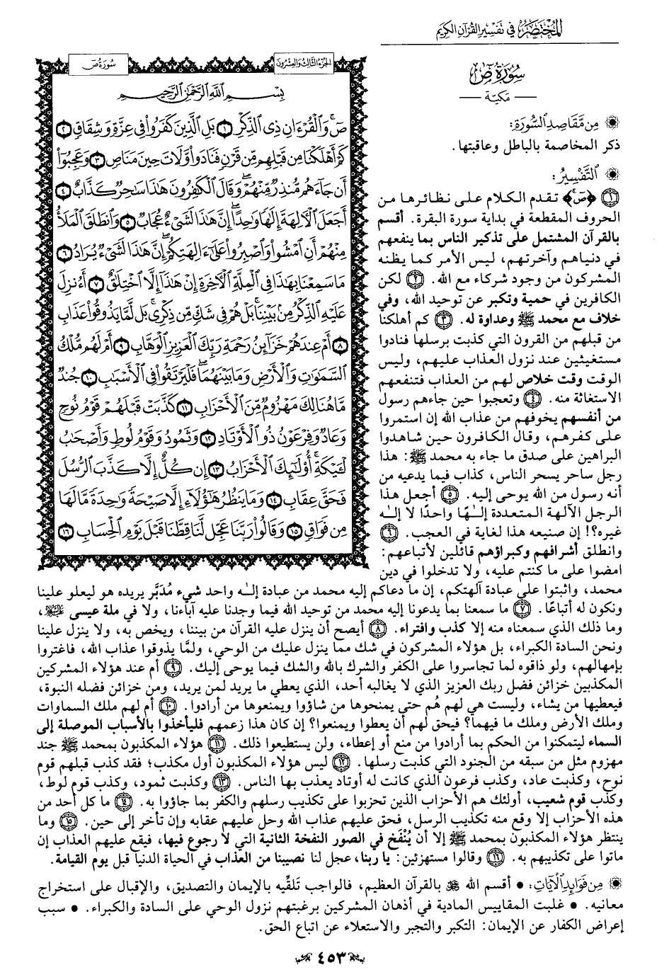 y 1 - {ص} تقدم الكلام على نظائرها من الحروف المقطعة في بداية سورة البقرة. أقسم بالقرآن المشتمل على تذكير الناس بما ينفعهم في دنياهم وآخرتهم، ليس الأمر كما يظنه المشركون من وجود شركاء مع الله.
