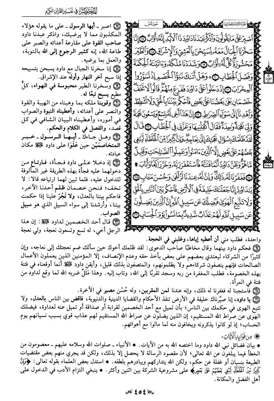 24 - فحكم داود بينهما وقال مخاطبًا صاحب الدعوى: لقد ظلمك أخوك حين سألك ضم نعجتك إلى نعاجه، وإن كثيرًا من الشركاء ليعتدي بعضهم على بعض بأخذ حقه وعدم الإنصاف، إلا المؤمنين الذين يعملون الأعمال الصالحات فإنهم ينصفون شركاءهم ولا يظلمونهم، والمتصفون بذلك قليل، وأيقن داود عليه السلام أنما أوقعناه في فتنة بهذه الخصومة، فطلب المغفرة من ربه وسجد تقربًا إلى الله، وتاب إليه. وهذا مَثَلٌ ضربه الله لما وقع لداود من فتنة في المرأة.