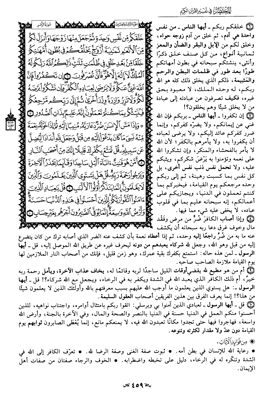 9 - أم من هو مطيع لله يقضي أوقات الليل ساجدًا لربه وقائمًا له، يخاف عذاب الآخرة، ويأمل رحمة ربه خيرٌ، أم ذلك الكافر الذي يعبد الله في الشدة ويكفر به في الرخاء، ويجعل مع الله شركاء؟! قل -أيها الرسول-: هل يستوي الذين يعلمون ما أوجب الله عليهم بسبب معرفتهم بالله وأولئك الذين لا يعلمون شيئًا من هذا؟! إنما يعرف الفرق بين هذين الفريقين أصحاب العقول السليمة.