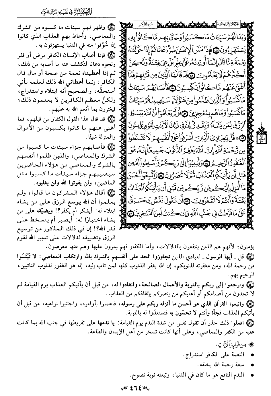 53 - قل -أيها الرسول- لعبادي الذين تجاوزوا الحد على أنفسهم بالشرك بالله وارتكاب المعاصي: لا تَيْئَسُوا من رحمة الله، ومن مغفرته لذنوبكم، إن الله يغفر الذنوب كلها لمن تاب إليه، إنه هو الغفور لذنوب التائبين، الرحيم بهم.