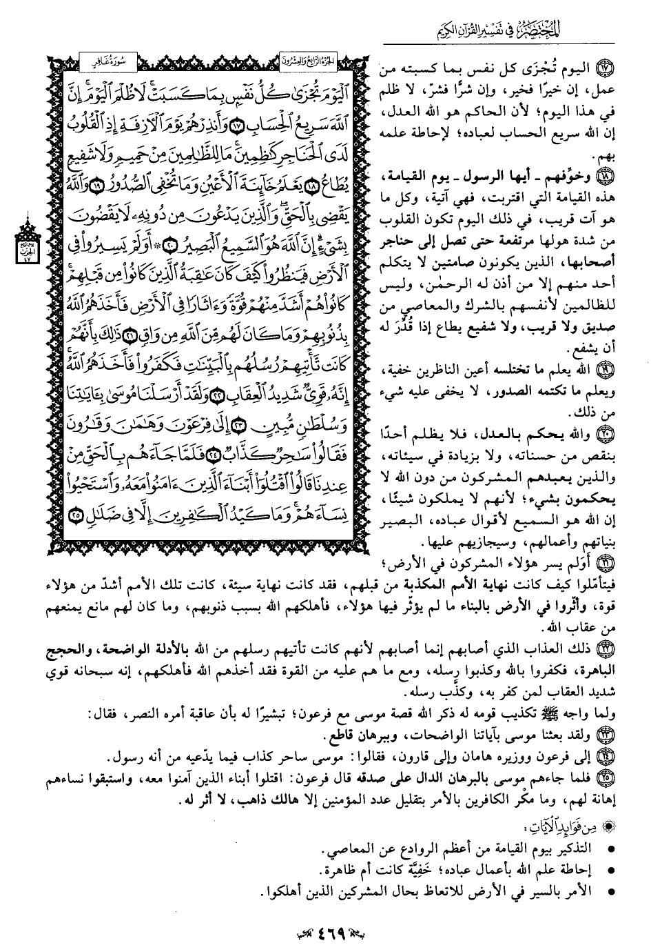 17 - اليوم تُجْزَى كل نفس بما كسبته من عمل، إن خيرًا فخير، وإن شرًّا فشر ظلم في هذا اليوم؛ لأن الحاكم هو الله العدل، إن الله سريع الحساب لعباده؛ لإحاطة علمه بهم.