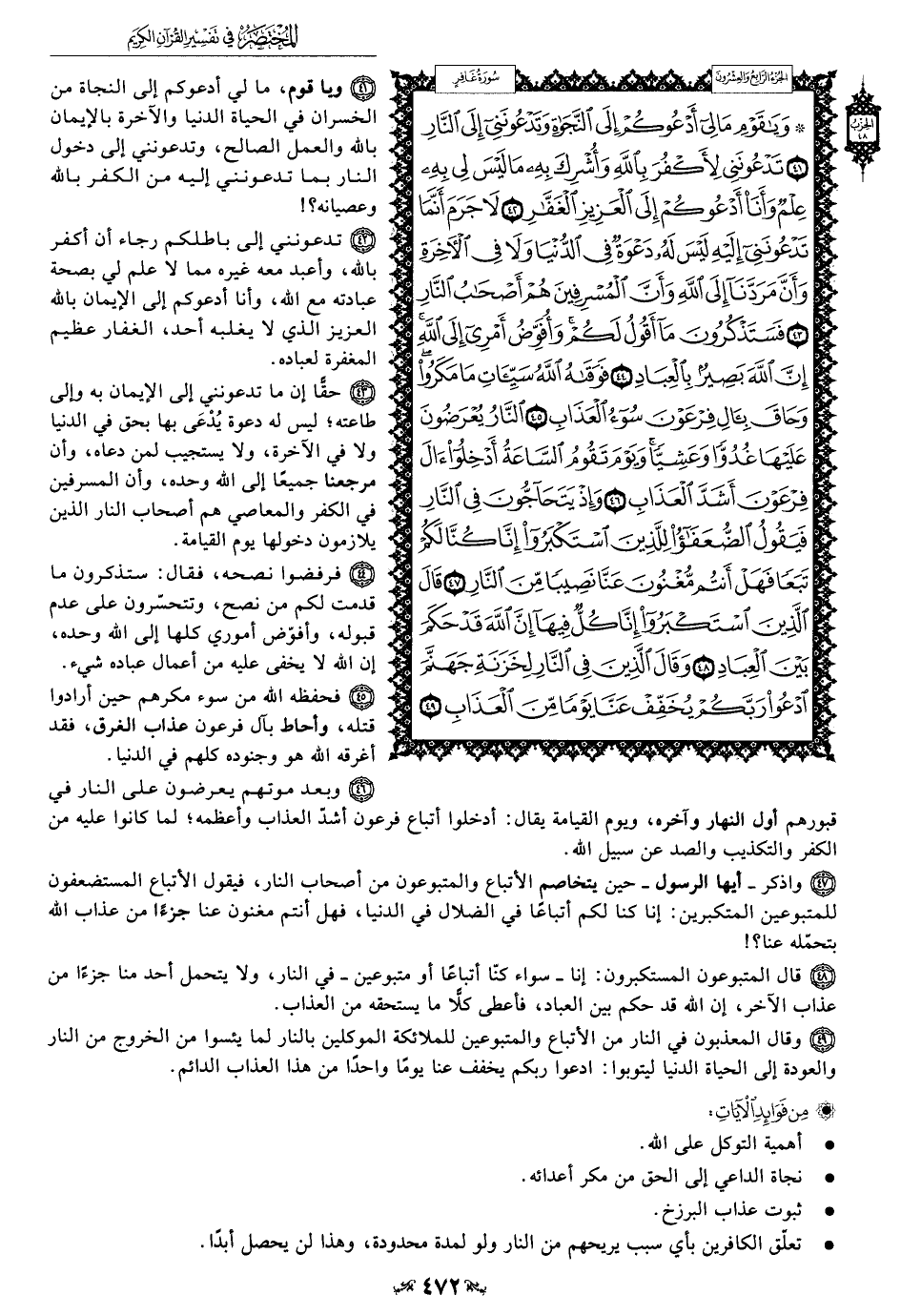 42 - تدعونني إلى باطلكم رجاء أن أكفر بالله، وأعبد معه غيره مما لا علم لي بصحة عبادته مع الله، وأنا أدعوكم إلى الإيمان بالله العزيز الذي لا يغلبه أحد، الغفار عظيم المغفرة لعباده.