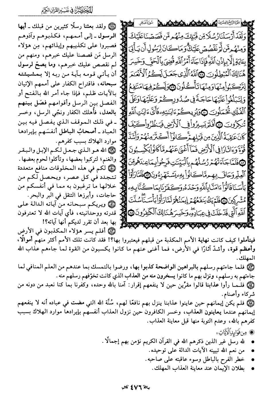 78 - ولقد بعثنا رسلًا كثيرين من قبلك -أيها الرسول- إلى أممهم، فكذبوهم وآذوهم فصبروا على تكذيبهم وإيذائهم، مِن هؤلاء الرسل مَن قصصنا عليك خبرهم، ومنهم من لم نقصص عليك خبرهم، وما يصح لرسول أن يأتي قومه بآية من ربه إلا بمشيئته سبحانه، اقتراح الكفار على أممهم الإتيان بالآيات ظلم، فإذا جاء أمر الله بالفتح أو الفصل بين الرسل وأقوامهم فصَل بينهم بالعدل، فأهلك الكفار ونجَّي الرسل، وخسر -في ذلك الموقف الذي يفصل فيه بين العباد- أصحابُ الباطل أنفسَهم بإيرادها موارد الهلاك بسبب كفرهم.
