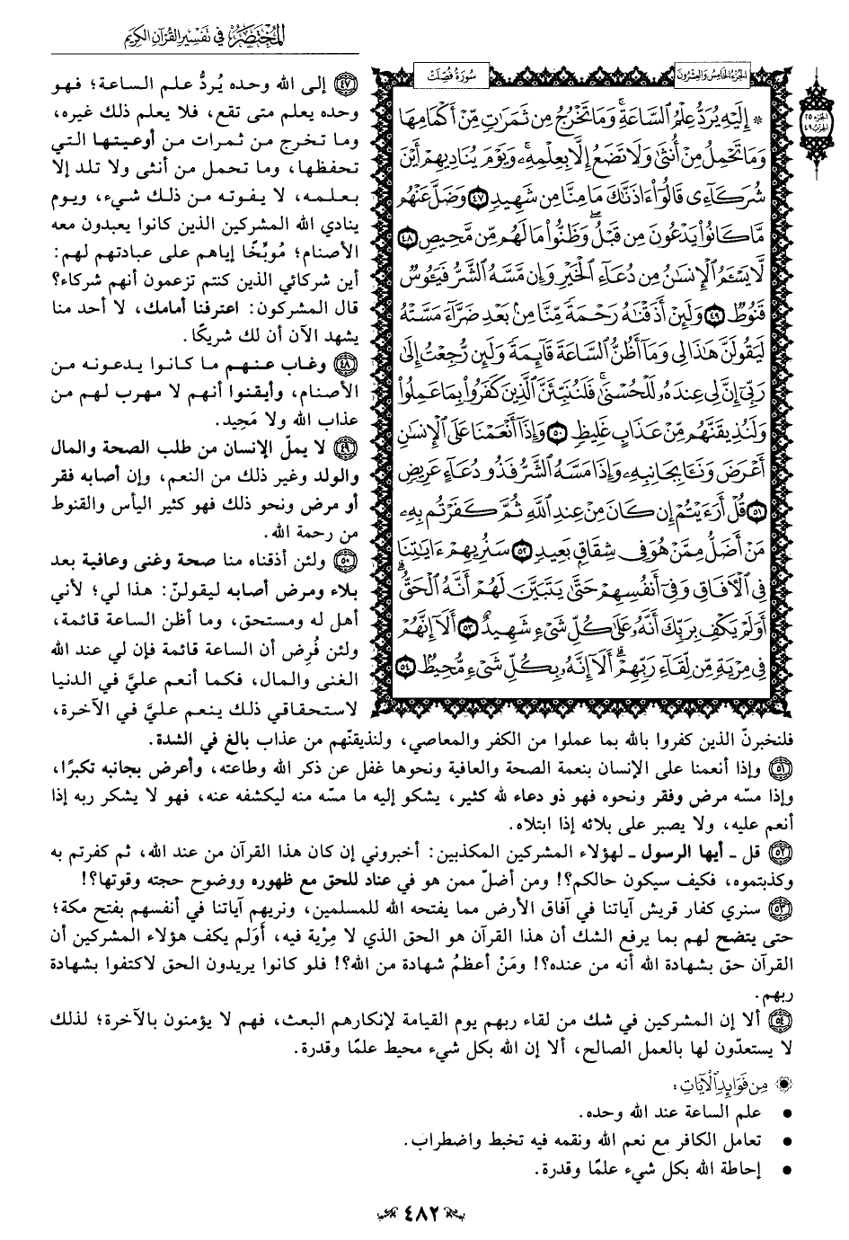 47 - إلى الله وحده يُردُّ علم الساعة؛ فهو وحده يعلم متى تقع، فلا يعلم ذلك غيره، وما تخرج من ثمرات من أوعيتها التي تحفظها، وما تحمل من أنثى ولا تلد إلا بعلمه، لا يفوته من ذلك شيء، ويوم ينادي الله المشركين الذين كانوا يعبدون معه الأصنام؛ مُوبِّخًا إياهم على عبادتهم لهم: أين شركائي الذين كنتم تزعمون أنهم شركاء؟ قال المشركون: اعترفنا أمامك، لا أحد منا يشهد الآن أن لك شريكًا.