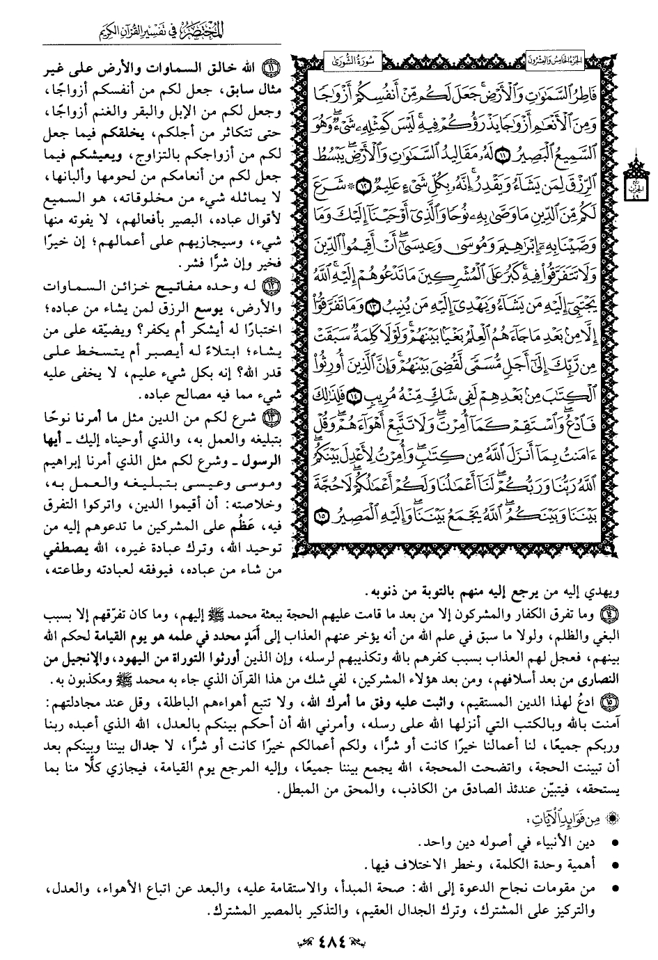15 - ادعُ لهذا الدين المستقيم، واثبت عليه وفق ما أمرك الله، ولا تتبع أهواءهم الباطلة، وقل عند مجادلتهم: آمنت بالله وبالكتب التي أنزلها الله على رسله، وأمرني الله أن أحكم بينكم بالعدل، الله الذي أعبده ربنا وربكم جميعًا، لنا أعمالنا خيرًا كانت أو شرًّا، ولكم أعمالكم خيرًا كانت أو شرًّا، لا جدال بيننا وبينكم بعد أن تبينت الحجة، واتضحت المحجة، الله يجمع بيننا جميعًا، وإليه المرجع يوم القيامة، فيجازي كلًّا منا بما يستحقه، فيتبيَّن عندئذ الصادق من الكاذب، والمحق من المبطل.