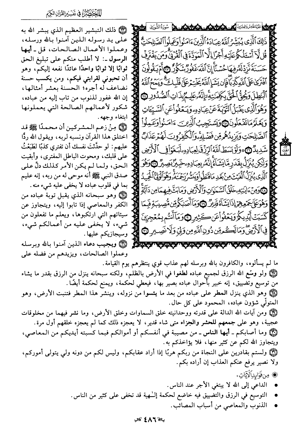 23 - ذلك التبشير العظيم الذي يبشر الله به على يد رسوله الذين آمنوا بالله ورسله، وعملوا الأعمال الصالحات، قل -أيها الرسول-: لا أطلب منكم على تبليغ الحق ثوابًا إلا ثوابًا واحدًا عائدًا نفعه إليكم، وهو أن تحبوني لقرابتي فيكم، ومن يكسب حسنة نضاعف له أجره؛ الحسنة بعشر أمثالها، إن الله غفور لذنوب من تاب إليه من عباده، شكور لأعمالهم الصالحة التي يعملونها ابتغاء وجهه.