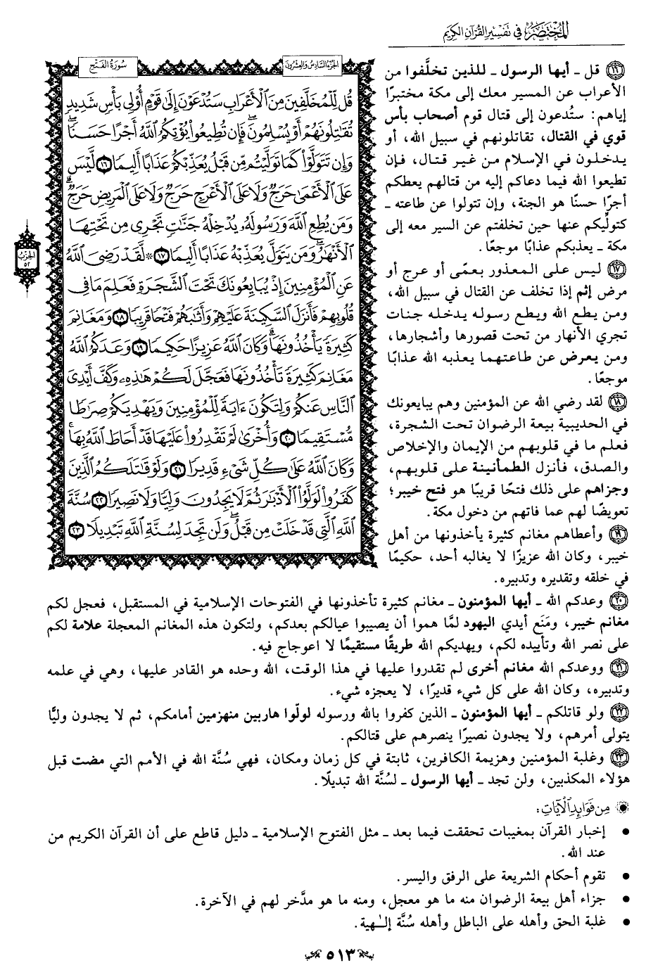 18 - لقد رضي الله عن المؤمنين وهم يبايعونك في الحديبية بيعة الرضوان تحت الشجرة، فعلم ما في قلوبهم من الإيمان والإخلاص والصدق، فأنزل الطمأنينة على قلوبهم، وجزاهم على ذلك فتحًا قريبًا هو فتح خيبر؛ تعويضًا لهم عما فاتهم من دخول مكة.