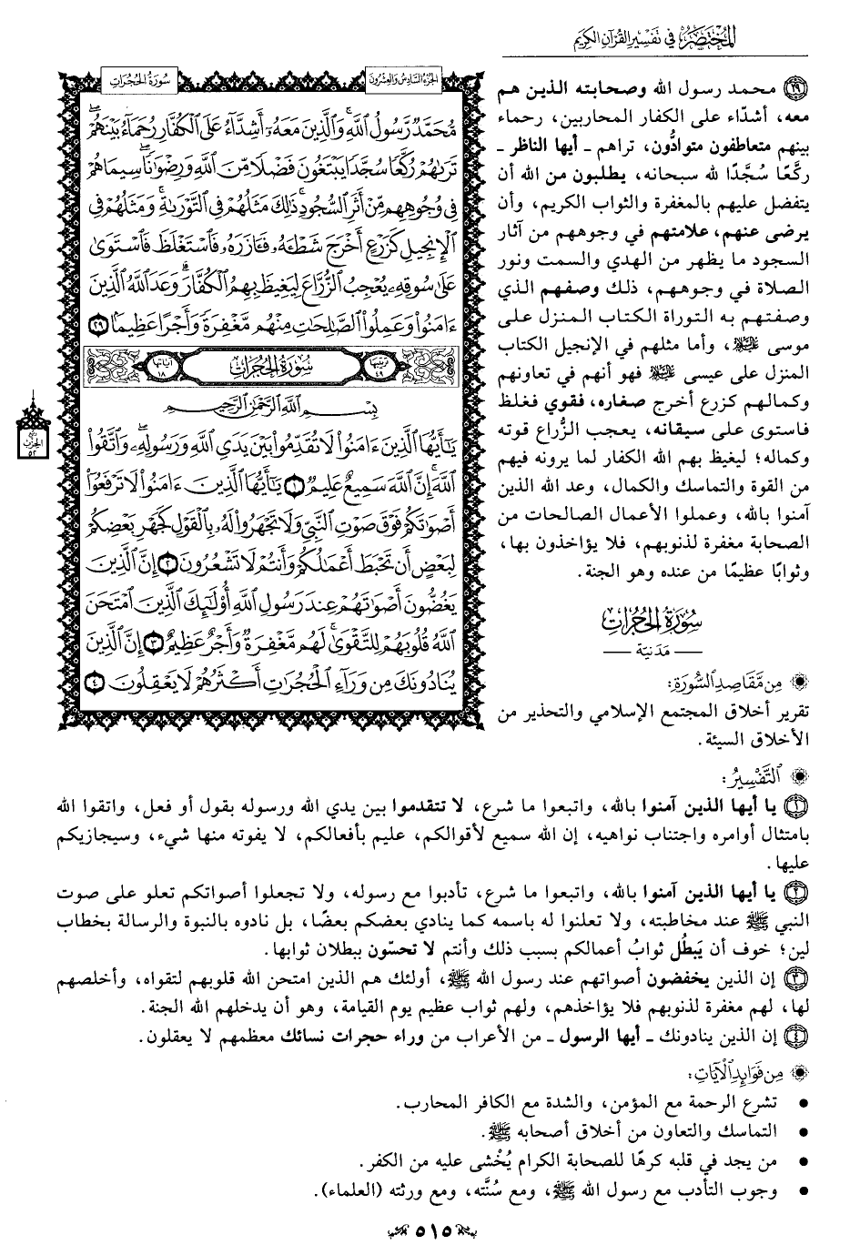 29 - محمد رسول الله وصحابته الذين هم معه، أشدّاء على الكفار المحاربين، رحماء بينهم متعاطفون متوادُّون، تراهم -أيها الناظر- ركَّعًا سُجَّدا لله سبحانه، يطلبون من الله أن يتفضل عليهم بالمغفرة والثواب الكريم، وأن يرضى عنهم، علامتهم في وجوههم من آثار السجود ما يظهر من الهدي والسمت ونور الصلاة في وجوههم، ذلك وصفهم الذي وصفتهم به التوراة الكتاب المنزل على موسى - عليه السلام -، وأما مثلهم في الإنجيل الكتاب المنزل على عيسى- عليه السلام - فهو أنهم في تعاونهم وكمالهم كزرع أخرج صغاره، فقوي فغلظ فاستوى على سيقانه، يعجب الزُّراع قوته وكماله؛ ليغيظ بهم الله الكفار لما يرونه فيهم من القوة والتماسك والكمال، وعد الله الذين آمنوا بالله، وعملوا الأعمال الصالحات من الصحابة مغفرة لذنوبهم، فلا يؤاخذون بها، وثوابًا عظيمًا من عنده وهو الجنة.