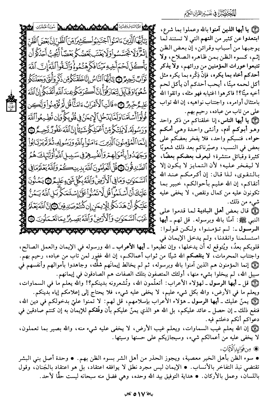 12 - يا أيها الذين آمنوا بالله وعملوا بما شرع، ابتعدوا عن كثير من التهم التي لا تستند لما يوجبها من أسباب وقرائن، إن بعض الظن إثم، كسوء الظن بمن ظاهره الصلاح، ولا تتبعوا عورات المؤمنين من ورائهم، ولا يذكر أحدكم أخاه بما يكره، فإنّ ذِكْره بما يكره مثل أكل لحمه ميتًا، أيحب أحدكم أن يأكل لحم أخيه ميتًا؟! فاكرهوا اغتيابه فهو مثله، واتقوا الله بامتثال أوامره، واجتناب نواهيه، إن الله تواب على من تاب من عباده، رحيم بهم.