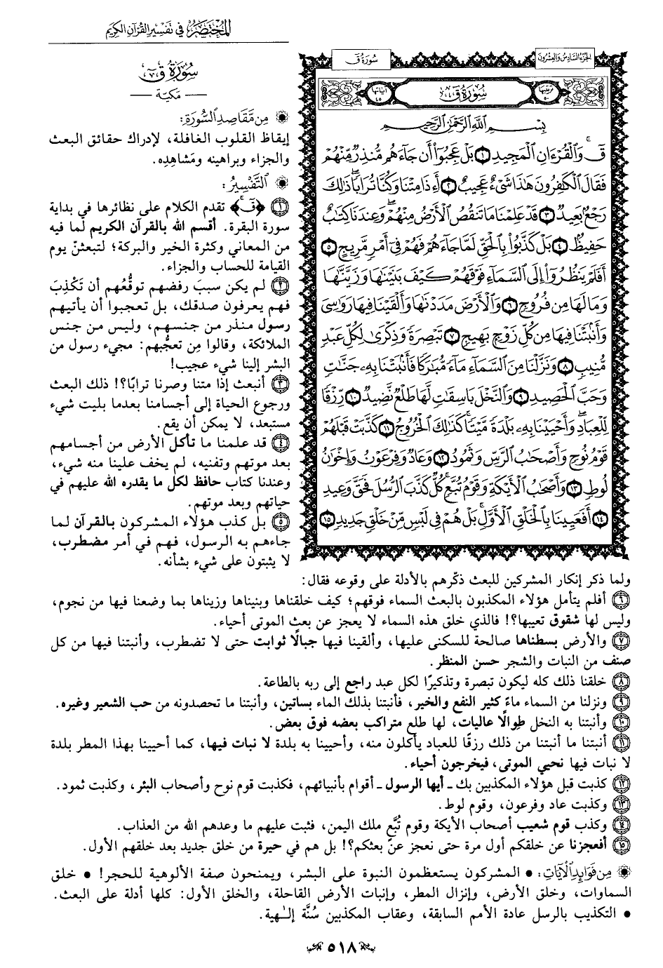 y 1 - {ق} تقدم الكلام على نظائرها في بداية سورة البقرة. أقسم الله بالقرآن الكريم لما فيه من المعاني وكثرة الخير والبركة؛ لتبعثنّ يوم القيامة للحساب والجزاء.
