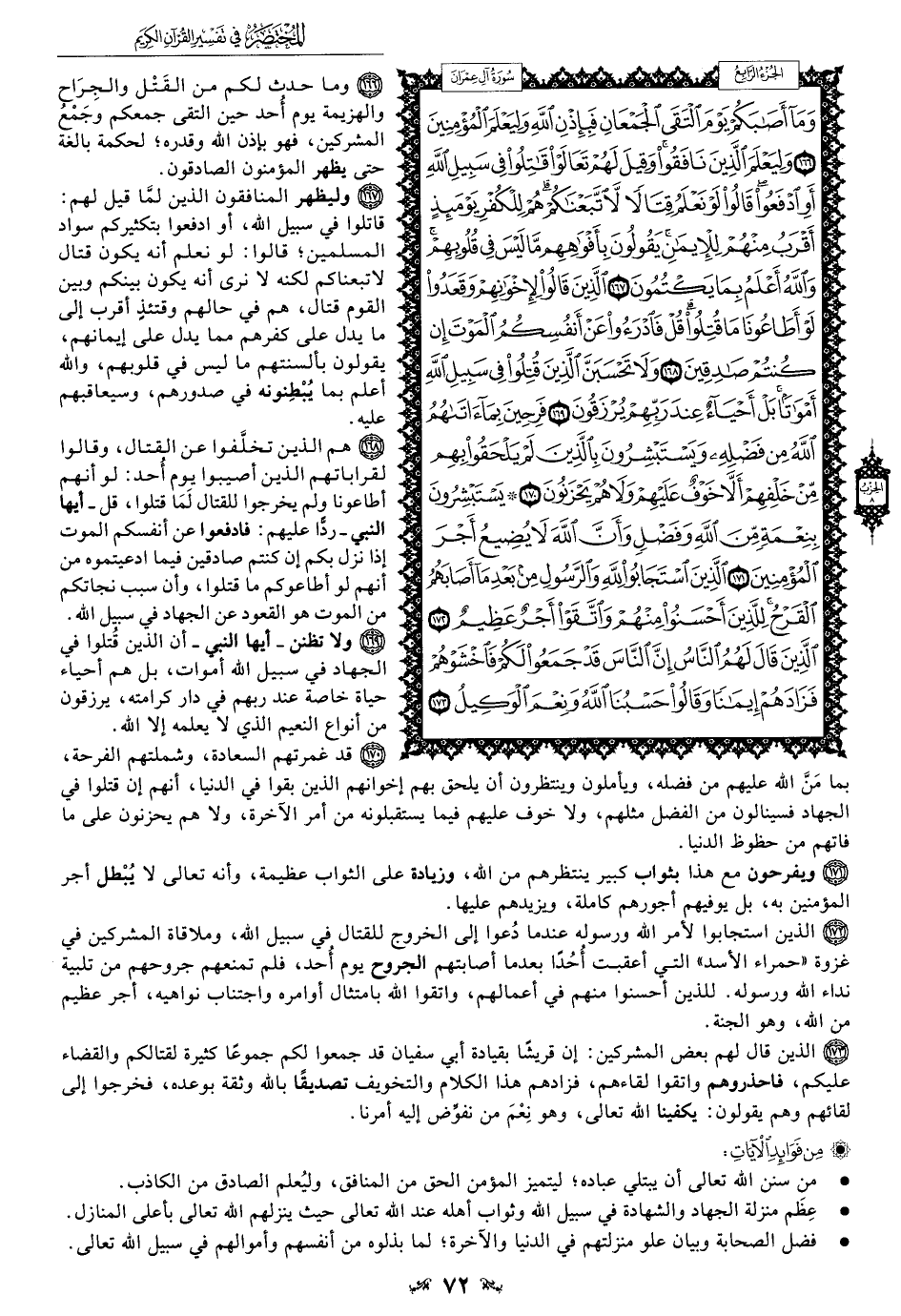 172 - الذين استجابوا لأمر الله ورسوله عندما دُعوا إلى الخروج للقتال في سبيل الله، وملاقاة المشركين في غزوة "حمراء الأسد" التي أعقبت أُحُدًا بعدما أصابتهم الجروح يوم أُحُد، فلم تمنعهم جروحهم من تلبية نداء الله ورسوله. للذين أحسنوا منهم في أعمالهم، واتقوا الله بامتثال أوامره واجتناب نواهيه، أجر عظيم من الله، وهو الجنة.