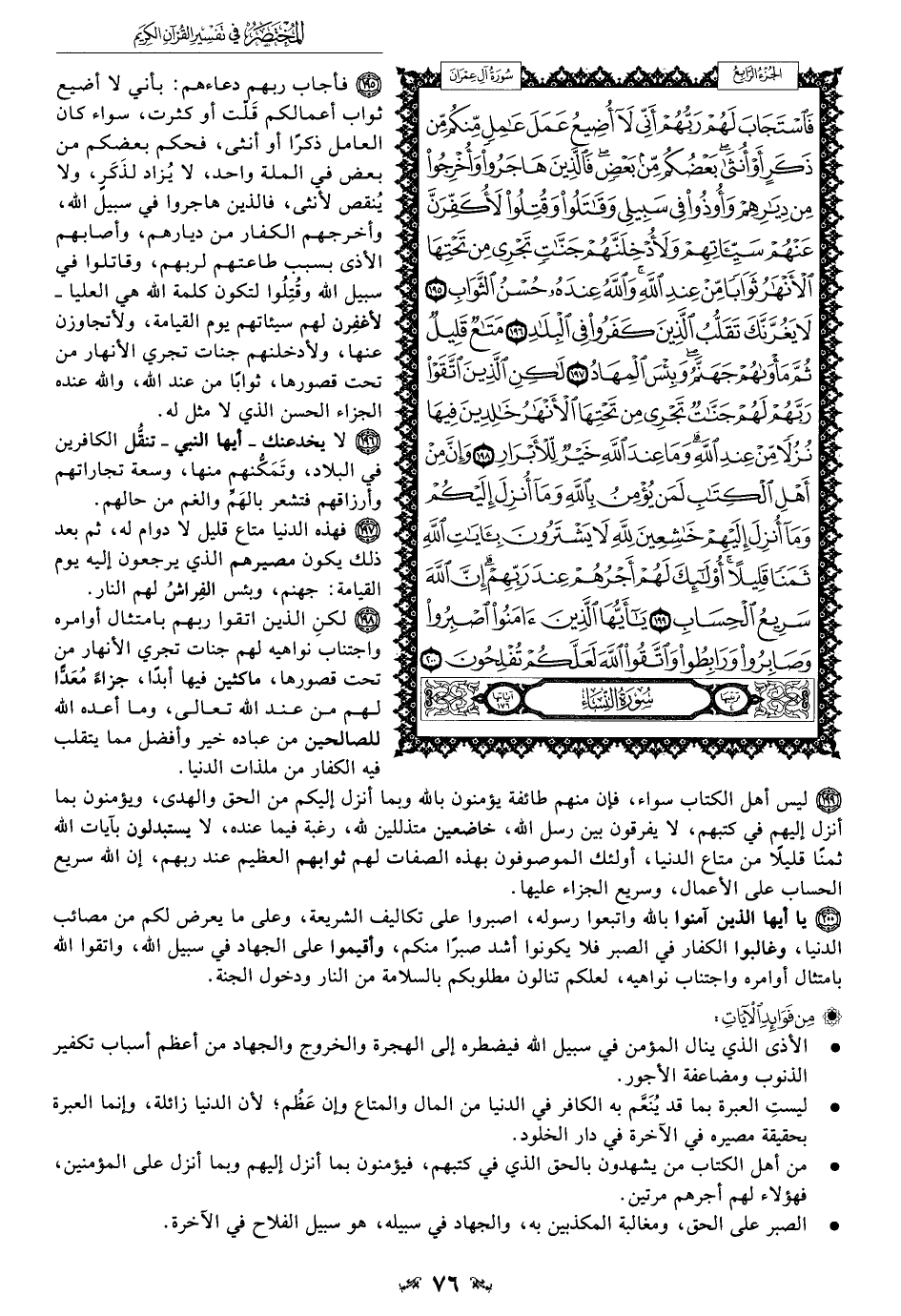 195 - فأجاب ربهم دعاءهم: بأني لا أضيع ثواب أعمالكم قَلَّت أو كثرت، سواء كان العامل ذكرًا أو أنثى، فحكم بعضكم من بعض في الملة واحد، لا يُزاد لذَكَرٍ، ولا يُنقص لأنثى، فالذين هاجروا في سبيل الله، وأخرجهم الكفار من ديارهم، وأصابهم الأذى بسبب طاعتهم لربهم، وقاتلوا في سبيل الله وقُتِلُوا لتكون كلمة الله هي العليا -لأغفِرن لهم سيئاتهم يوم القيامة، ولأتجاوزن عنها، ولأُدخلنهم جنات تجري الأنهار من تحت قصورها، ثوابًا من عند الله، والله عنده الجزاء الحسن الذي لا مثل له.