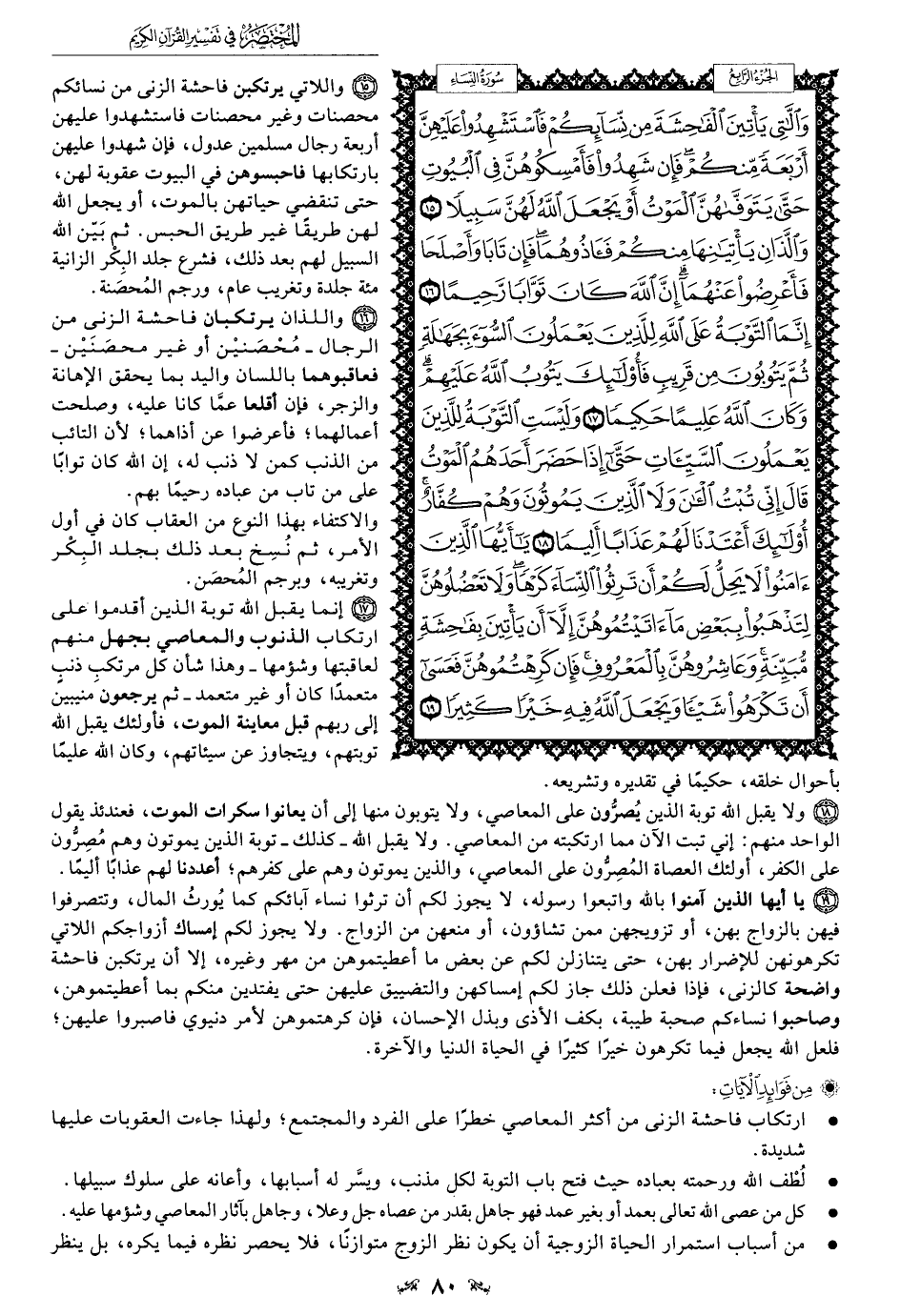 15 - واللاتي يرتكبن فاحشة الزنى من نسائكم محصنات وغير محصنات فاستشهدوا عليهن أربعة رجال مسلمين عدول، فإن شهدوا عليهن بارتكابها فاحبسوهن في البيوت عقوبة لهن، حتى تنقضي حياتهن بالموت، أو يجعل الله لهن طريقًا غير طريق الحبس. ثم بَيّن الله السبيل لهم بعد ذلك، فشرع جلد البكر الزانية مئة جلدة وتغريب عام، ورجم المُحصَنة.