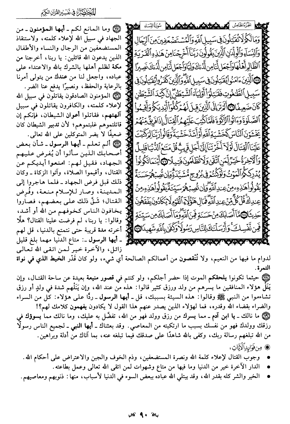 x• وجوب القتال لإعلاء كلمة الله ونصرة المستضعفين، وذم الخوف والجبن والاعتراض على أحكام الله.