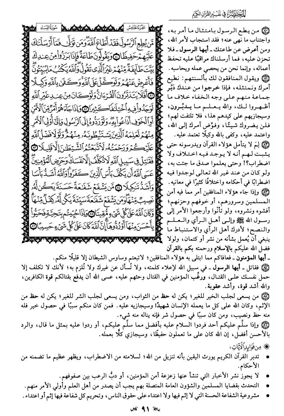 83 - وإذا جاء هؤلاء المنافقين أمر مما فيه أمن المسلمين وسرورهم، أو خوفهم وحزنهم؛ أفشوه ونشروه، ولو تأنّوا وأرجعوا الأمر إلى رسول الله - صلى الله عليه وسلم - وإلى أهل الرأي والعلم والنصح؛ لأدرك أهل الرأي والاستنباط ما ينبغي أن يُعمل بشأنه من نشر أو كتمان، ولولا فضل الله عليكم بالاسلام ورحمته بكم بالقرآن -أيها المؤمنون- فعافاكم مما ابتلى به هؤلاء المنافقين؛ لاتبعتم وساوس الشيطان إلا قليلًا منكم.