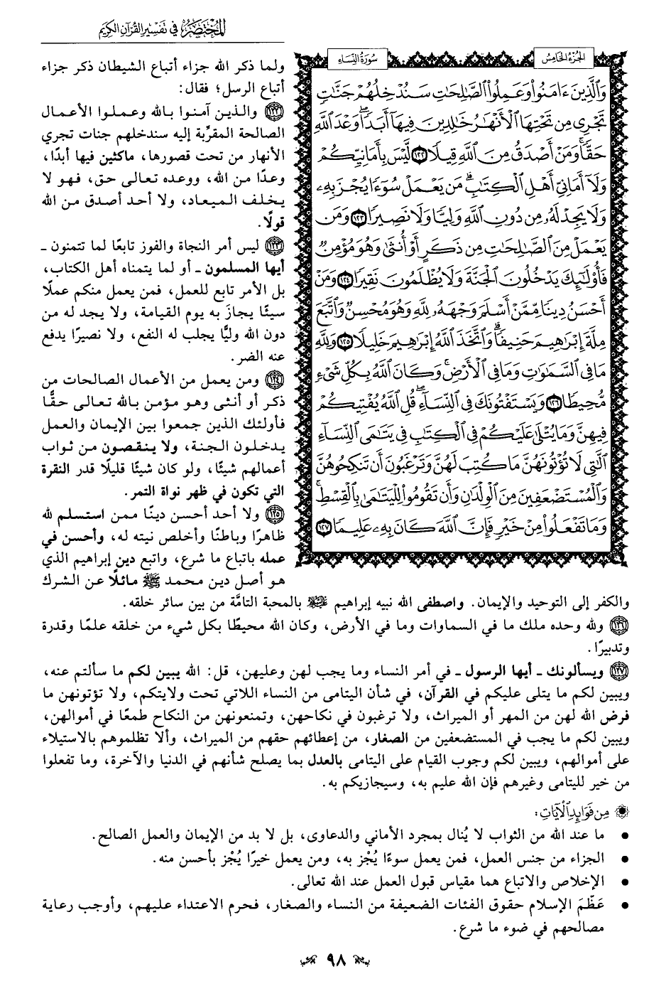 124 - ومن يعمل من الأعمال الصالحات من ذكر أو أنثى وهو مؤمن بالله تعالى حقًّا فأولئك الذين جمعوا بين الإيمان والعمل يدخلون الجنة، ولا ينقصون من ثواب أعمالهم شيئًا، ولو كان شيئًا قليلًا قدر النقرة التي تكون في ظهر نواة التمر.
