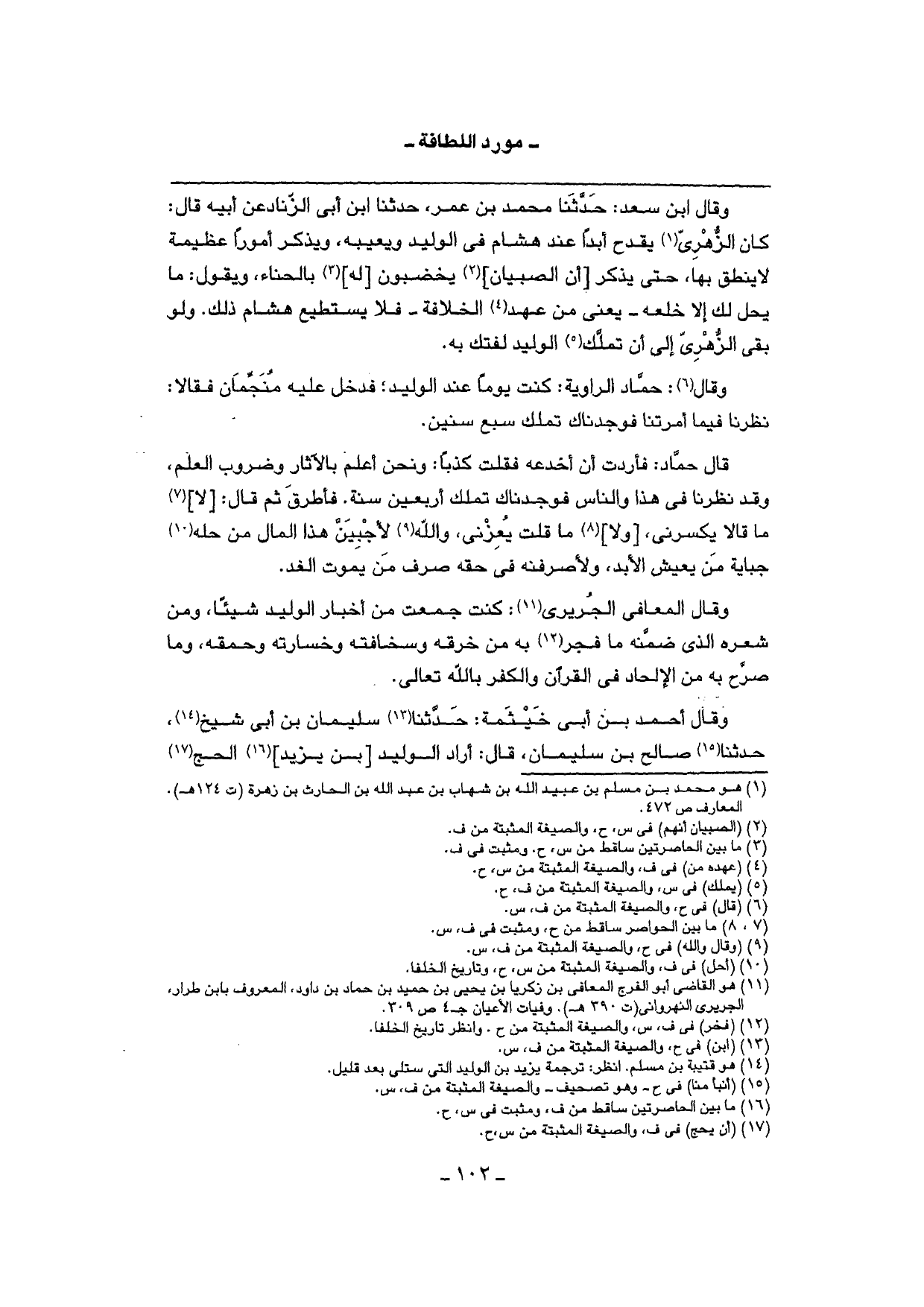 وَقَالَ الْمعَافي الْجريرِي: كنت جمعت من أَخْبَار الْوَلِيد شَيْئا، وَمن شعره الَّذِي ضمنه مَا فجر بِهِ من خرقه وسخافته وخسارته وحمقه، وَمَا صرح بِهِ من الْإِلْحَاد فِي الْقُرْآن وَالْكفْر بِاللَّه تَعَالَى.