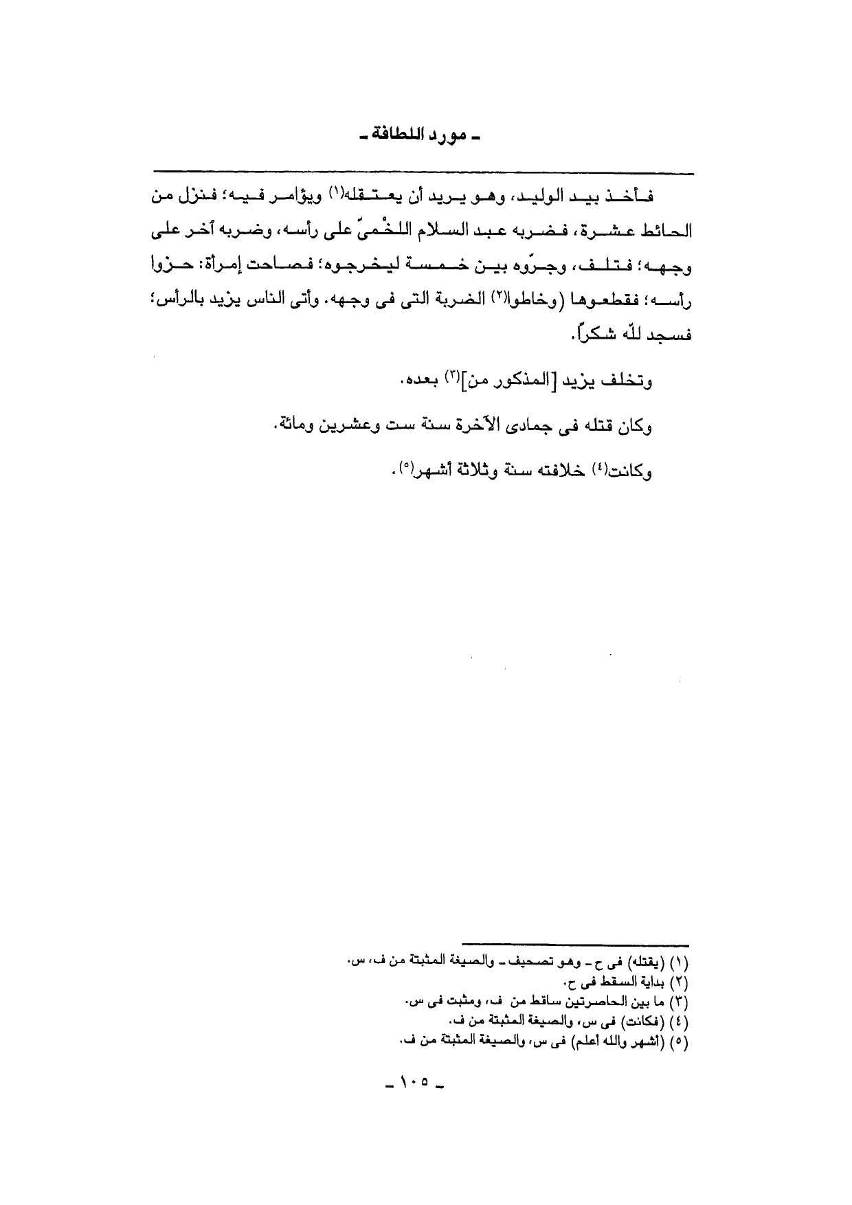 فَأخذ بيد الْوَلِيد، وَهُوَ يُرِيد أَن يعتقله ويؤامر فِيهِ؛ فَنزل من الْحَائِط عشرَة؛ فَضَربهُ عبد السَّلَام اللَّخْمِيّ على رَأسه، وضربه آخر على وَجهه؛ فَتلف، وجروه بَين خَمْسَة ليخرجوه؛ فصاحت إمرأة: حزوا رَأسه؛ فقطعوها (وخاطوا الضَّرْبَة الَّتِي فِي وَجهه. وأتى النَّاس يزِيد بِالرَّأْسِ؛ فَسجدَ لله شكرا.