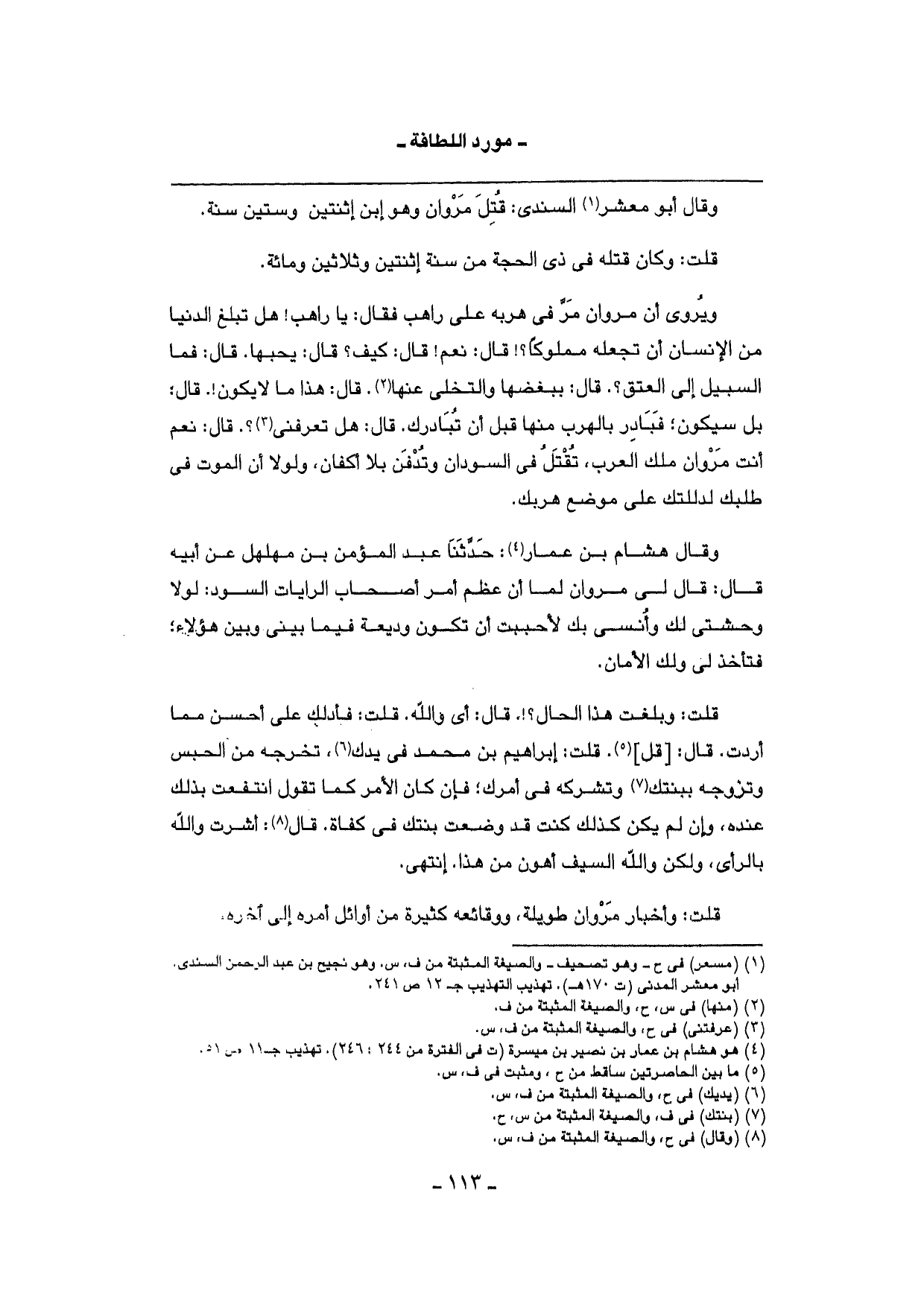 ويروى أَن مَرْوَان مر فِي هربه على رَاهِب فَقَالَ: يَا رَاهِب {هَل تبلغ الدُّنْيَا من الْإِنْسَان أَن تَجْعَلهُ مَمْلُوكا؟} قَالَ: نعم {قَالَ: كَيفَ؟ قَالَ: يُحِبهَا. قَالَ: فَمَا السَّبِيل إِلَى الْعتْق؟ . قَالَ: ببغضها والتخلي عَنْهَا. قَالَ: هَذَا مَا لَا يكون} . قَالَ: بل سَيكون؛ فبادر بالهرب مِنْهَا قبل أَن تبادرك. قَالَ: هَل تعرفنِي؟ . قَالَ: نعم أَنْت مَرْوَان ملك الْعَرَب، تقتل فِي السودَان وتدفن بِلَا أكفان، وَلَوْلَا أَن الْمَوْت فِي طَلَبك لدللتك على مَوضِع هربك.