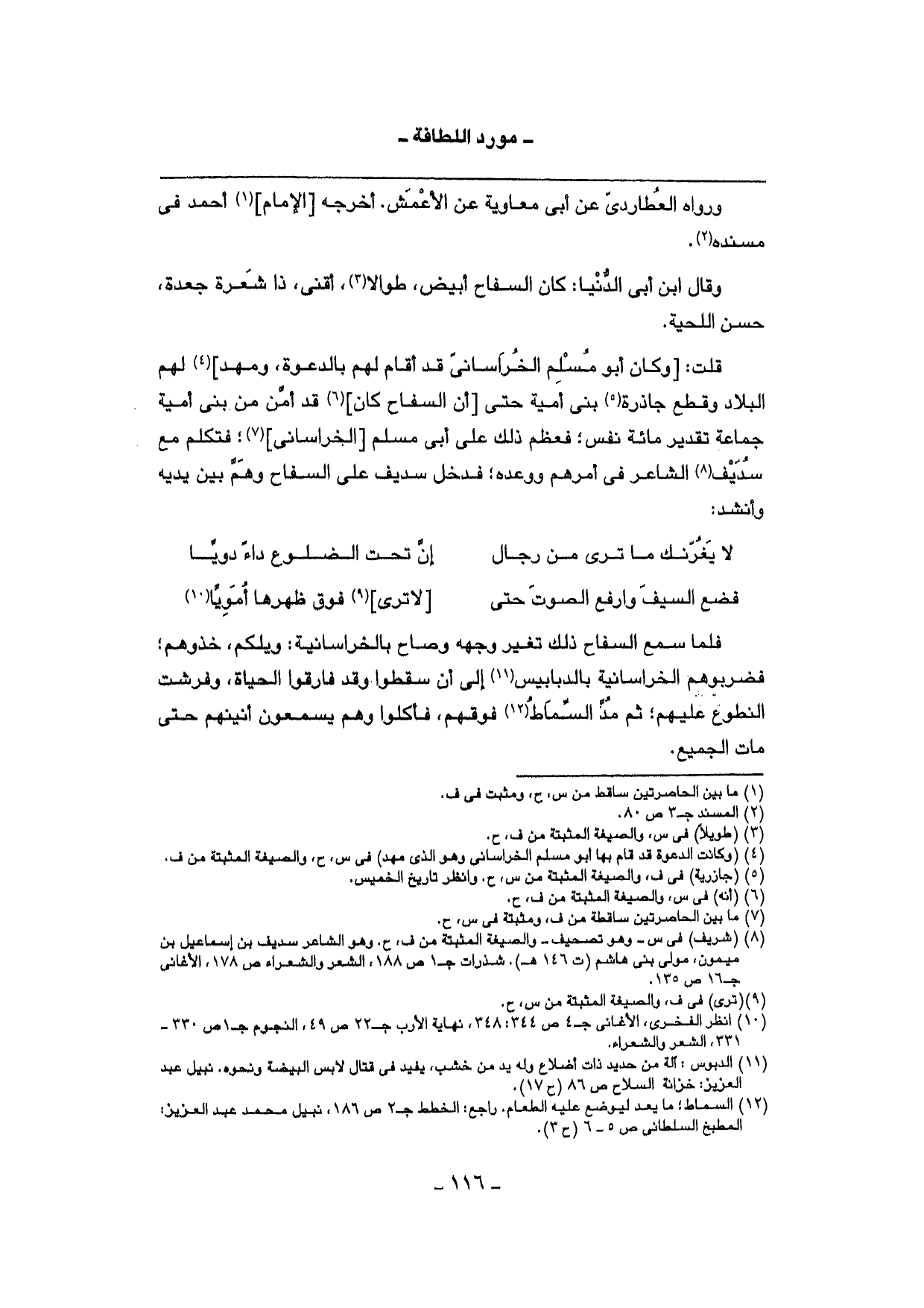 قلت: [وَكَانَ أَبُو مُسلم الْخُرَاسَانِي قد أَقَامَ لَهُم بالدعوة، ومهد] لَهُم الْبِلَاد وَقطع جاذرة بني أُميَّة حَتَّى [أَن السفاح كَانَ] قد أَمن من بني أُميَّة جمَاعَة تَقْدِير مائَة نفس؛ فَعظم ذَلِك على أبي مُسلم [الْخُرَاسَانِي] ؛ فَتكلم مَعَ سديف الشَّاعِر فِي أَمرهم ووعده؛ فَدخل سديف على السفاح وهم بَين يَدَيْهِ وَأنْشد: