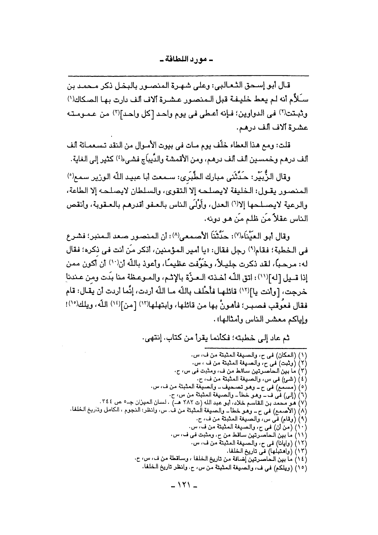 قَالَ أَبُو إِسْحَق الثعالبي: وعَلى شهرة الْمَنْصُور بالبخل ذكر مُحَمَّد بن سَلام أَنه لم يُعْط خَليفَة قبل الْمَنْصُور عشرَة آلَاف ألف دارت بهَا الصكاك وَثبتت فِي الدَّوَاوِين؛ فَإِنَّهُ أعْطى فِي يَوْم وَاحِد [كل وَاحِد] من عمومته عشرَة آلَاف ألف دِرْهَم.