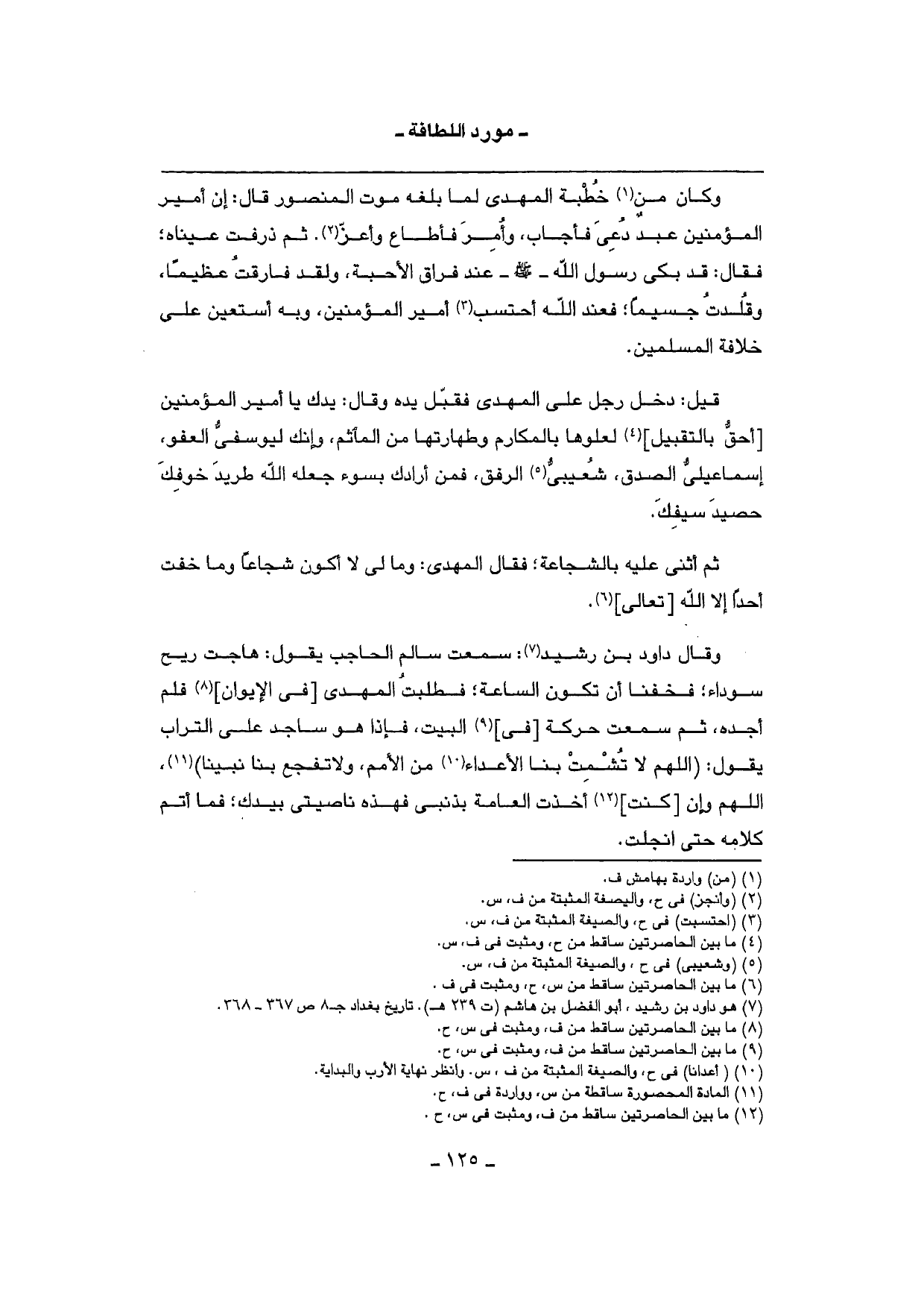وَكَانَ من خطْبَة الْمهْدي لما بلغه موت الْمَنْصُور قَالَ: إِن أَمِير الْمُؤمنِينَ عبد دعِي فَأجَاب، وَأمر فأطاع وأعز. ثمَّ ذرفت عَيناهُ؛ فَقَالَ: قد بَكَى رَسُول الله -[صلى الله عَلَيْهِ وَسلم]- عِنْد فِرَاق الْأَحِبَّة، وَلَقَد فَارَقت عَظِيما، وقلدت جسيما؛ فَعِنْدَ الله أحتسب أَمِير الْمُؤمنِينَ، وَبِه أستعين على خلَافَة الْمُسلمين.