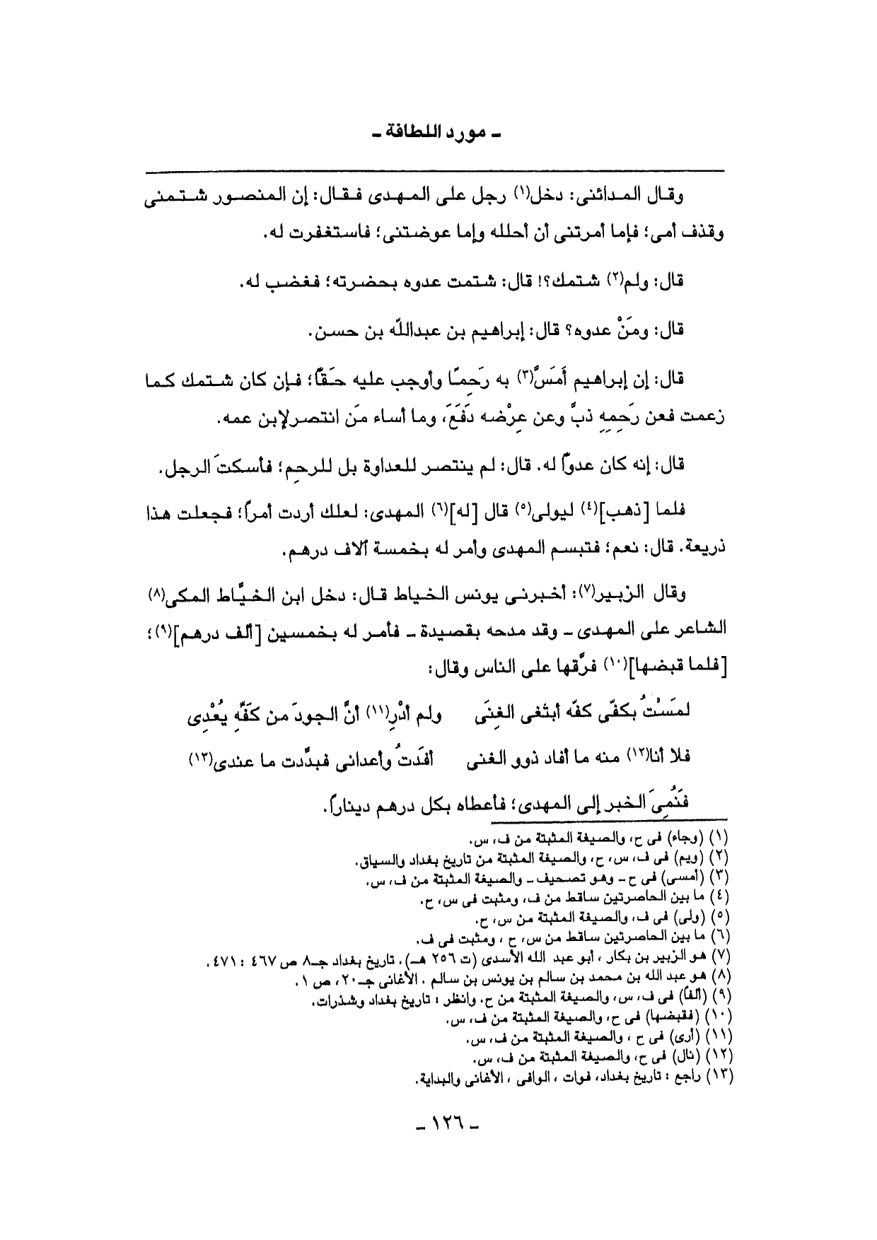 وَقَالَ الْمَدَائِنِي: دخل رجل على الْمهْدي فَقَالَ: إِن الْمَنْصُور شَتَمَنِي وَقذف أُمِّي؛ فإمَّا أَمرتنِي أَن أحلله وَإِمَّا عوضتني؛ فاستغفرت لَهُ.