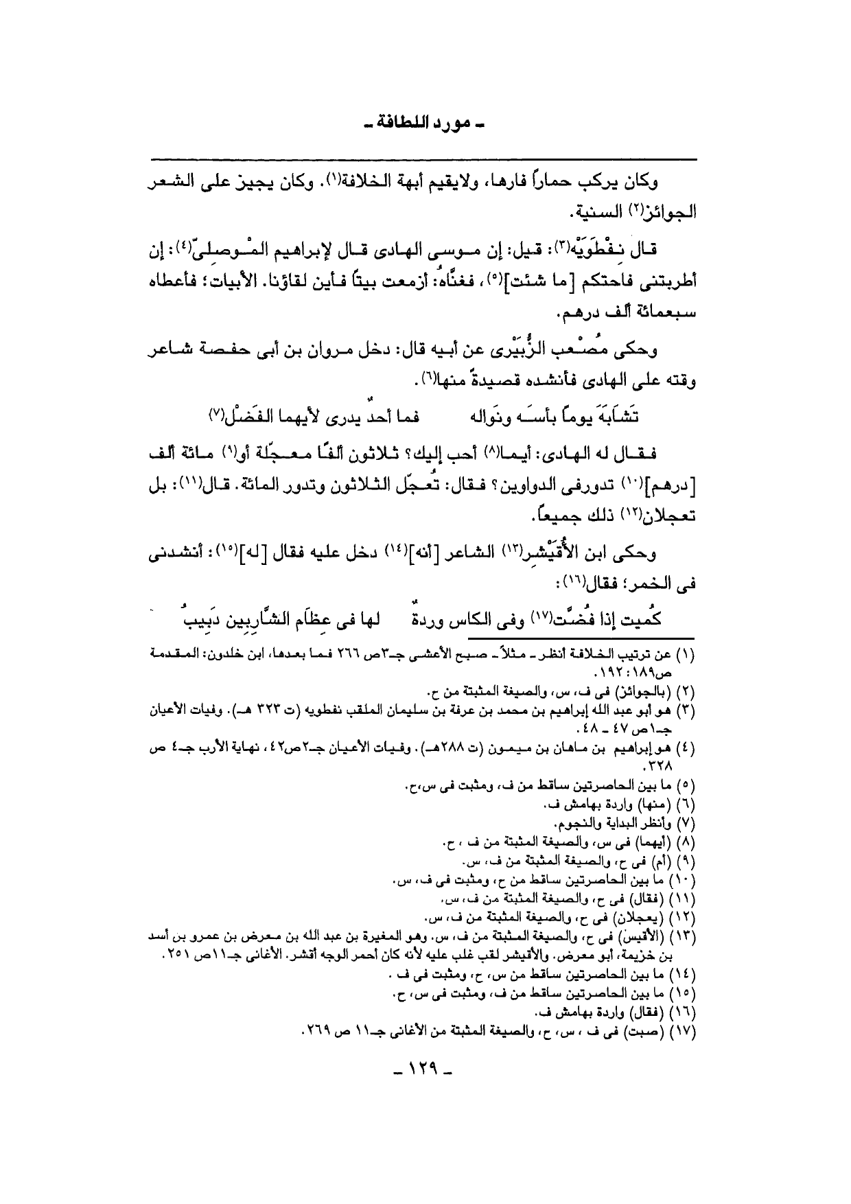 وَحكى مُصعب الزبيرِي عَن أَبِيه قَالَ: دخل مَرْوَان بن أبي حَفْصَة شَاعِر وقته على الْهَادِي فأنشده قصيدة مِنْهَا.