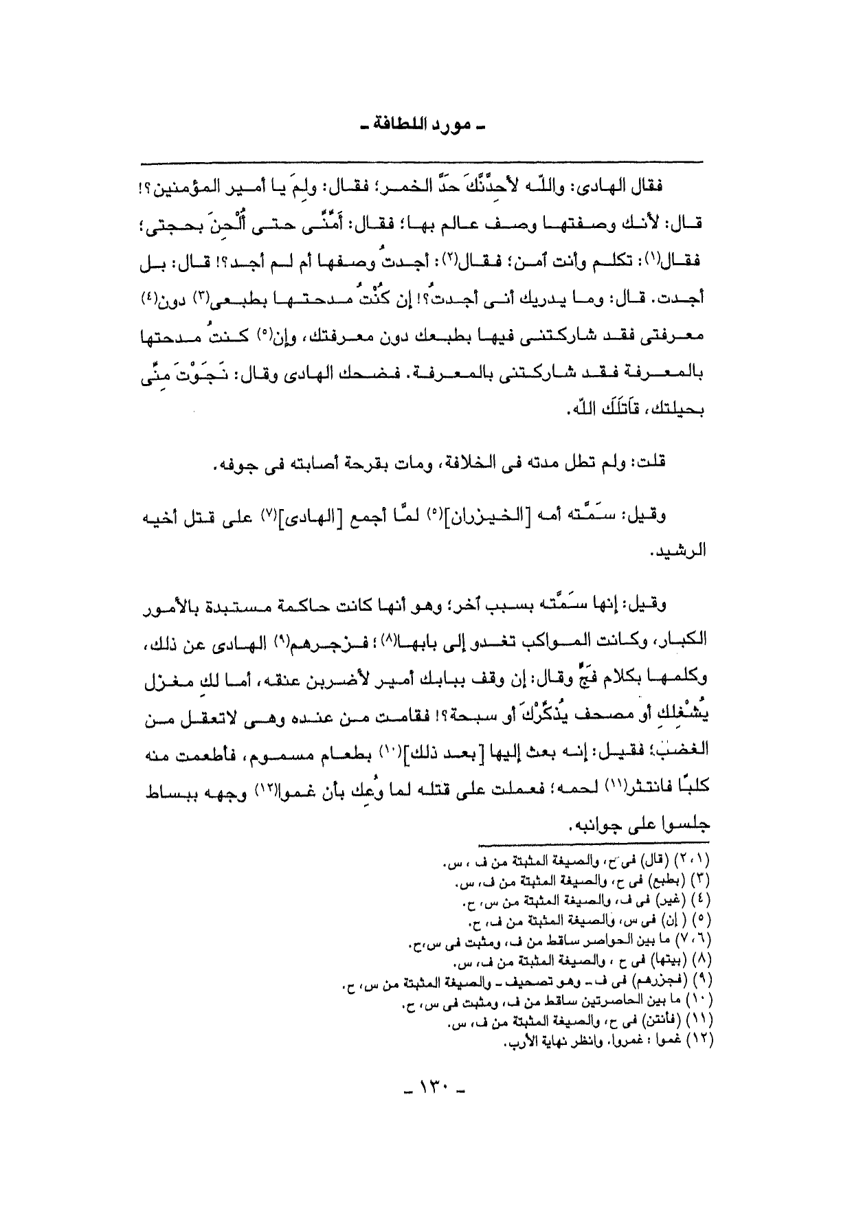 فَقَالَ الْهَادِي: وَالله لأحدنك حد الْخمر؛ فَقَالَ: وَلم يَا أَمِير الْمُؤمنِينَ؟ {قَالَ: لِأَنَّك وصفتها وصف عَالم بهَا؛ فَقَالَ: أمني حَتَّى أَلحن بحجتي؛ فَقَالَ: تكلم وَأَنت آمن؛ فَقَالَ: أَجدت وصفهَا أم لم أجد؟} قَالَ: بل أَجدت. قَالَ: وَمَا يدْريك أَنِّي أَجدت؟ {إِن كنت مدحتها بطبعي دون معرفتي فقد شاركتني فِيهَا بطبعك دون معرفتك، وَإِن كنت مدحتها بالمعرفة فقد شاركتني بالمعرفة. فَضَحِك الْهَادِي وَقَالَ: نجوت مني بحيلتك، قَاتلك الله.