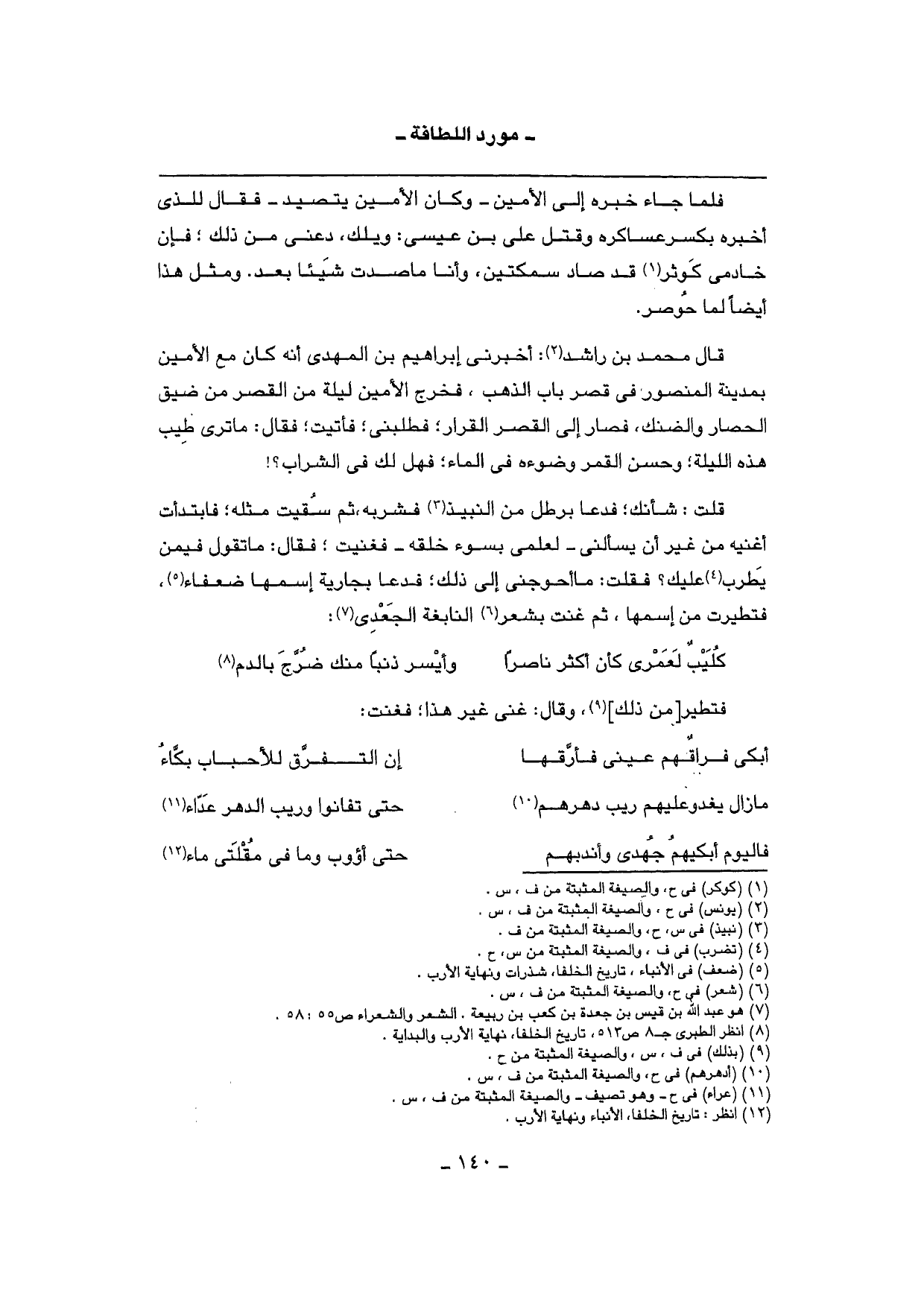 قلت: شَأْنك؛ فَدَعَا برطل من النَّبِيذ فشربه، ثمَّ سقيت مثله؛ فابتدأت أغنيه من غير أَن يسألني - لعلمي بِسوء خلقه - فغنيت؛ فَقَالَ: مَا تَقول فِيمَن يطرب عَلَيْك؟ فَقلت: مَا أحوجني إِلَى ذَلِك؛ فَدَعَا بِجَارِيَة إسمها ضعفاء، فتطيرت من إسمها، ثمَّ غنت بِشعر النَّابِغَة الْجَعْدِي: