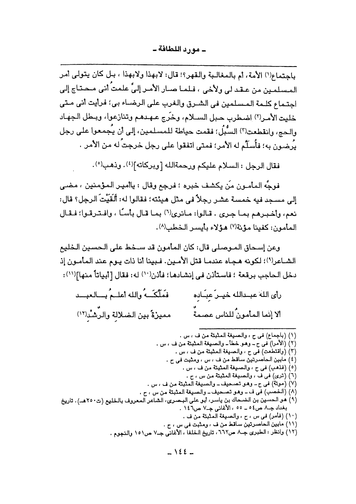 وَعَن إِسْحَاق الْموصِلِي قَالَ: كَانَ الْمَأْمُون قد سخط على الْحُسَيْن الخليع الشَّاعِر؛ لكَونه هجاه عِنْدَمَا قتل الْأمين: فَبينا أَنا ذَات يَوْم عِنْد الْمَأْمُون إِذْ دخل الْحَاجِب برقعة؛ فَاسْتَأْذن فِي إنشادها؛ فَأذن لَهُ: فَقَالَ [أبياتا مِنْهَا] :
