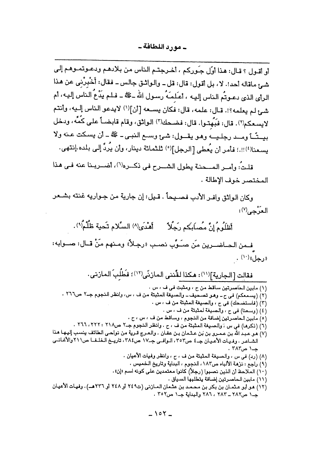 أَو أَقُول؟ قَالَ: هَذَا أول جوركم، أخرجتم النَّاس من بِلَادهمْ ودعوتموهم إِلَى شَيْء مَا قَالَه أحد {. لَا، بل أَقُول: قَالَ: قل - والواثق جَالس - فَقَالَ: أَخْبرنِي عَن هَذَا الرَّأْي الَّذِي دعوتم النَّاس إِلَيْهِ، أعلمهُ رَسُول الله -[صلى الله عَلَيْهِ وَسلم]- فَلم يدع النَّاس إِلَيْهِ، أم شَيْء لم يُعلمهُ؟} قَالَ: علمه، قَالَ: فَكَانَ يَسعهُ [أَن] لَا يَدْعُو النَّاس إِلَيْهِ، وَأَنْتُم لَا يَسَعكُمْ. قَالَ: فَبُهِتُوا. قَالَ: فَضَحِك الواثق، وَقَامَ قَابِضا على كمه، وَدخل بَيْتا وَمد رجلَيْهِ وَهُوَ يَقُول: شَيْء وسع النَّبِي -[صلى الله عَلَيْهِ وَسلم]- أَن يسكت عَنهُ وَلَا يسعنا {} ؛ فَأمر أَن يعْطى [الرجل] ثلثمِائة دِينَار، وَأَن يرد إِلَى بَلَده. إنتهى.