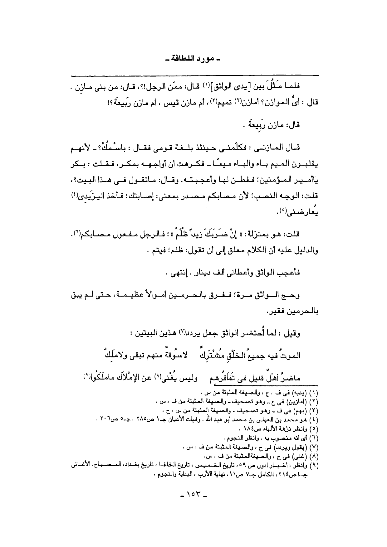 فَلَمَّا مثل بَين [يَدي الواثق] قَالَ: مِمَّن الرجل {؟ ، قَالَ: من بني مَازِن. قَالَ: أَي الموازن؟ أمازن تَمِيم، أم مَازِن قيس، أم مَازِن ربيعَة؟}