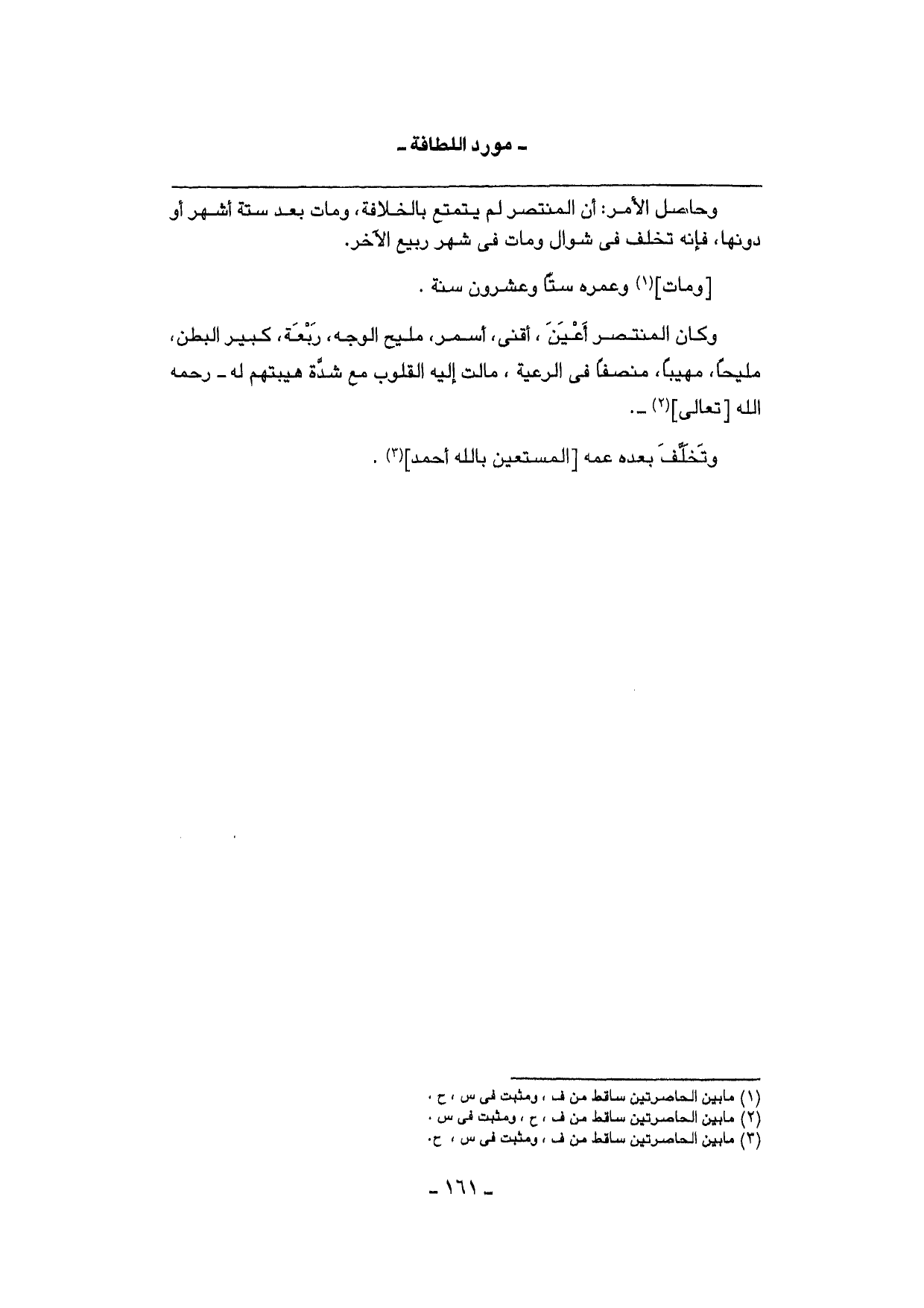 وَحَاصِل الْأَمر: أَن الْمُنْتَصر لم يتمتع بالخلافة، وَمَات بعد سِتَّة أشهر أَو دونهَا، فَإِنَّهُ تخلف فِي شَوَّال وَمَات فِي شهر ربيع الآخر.