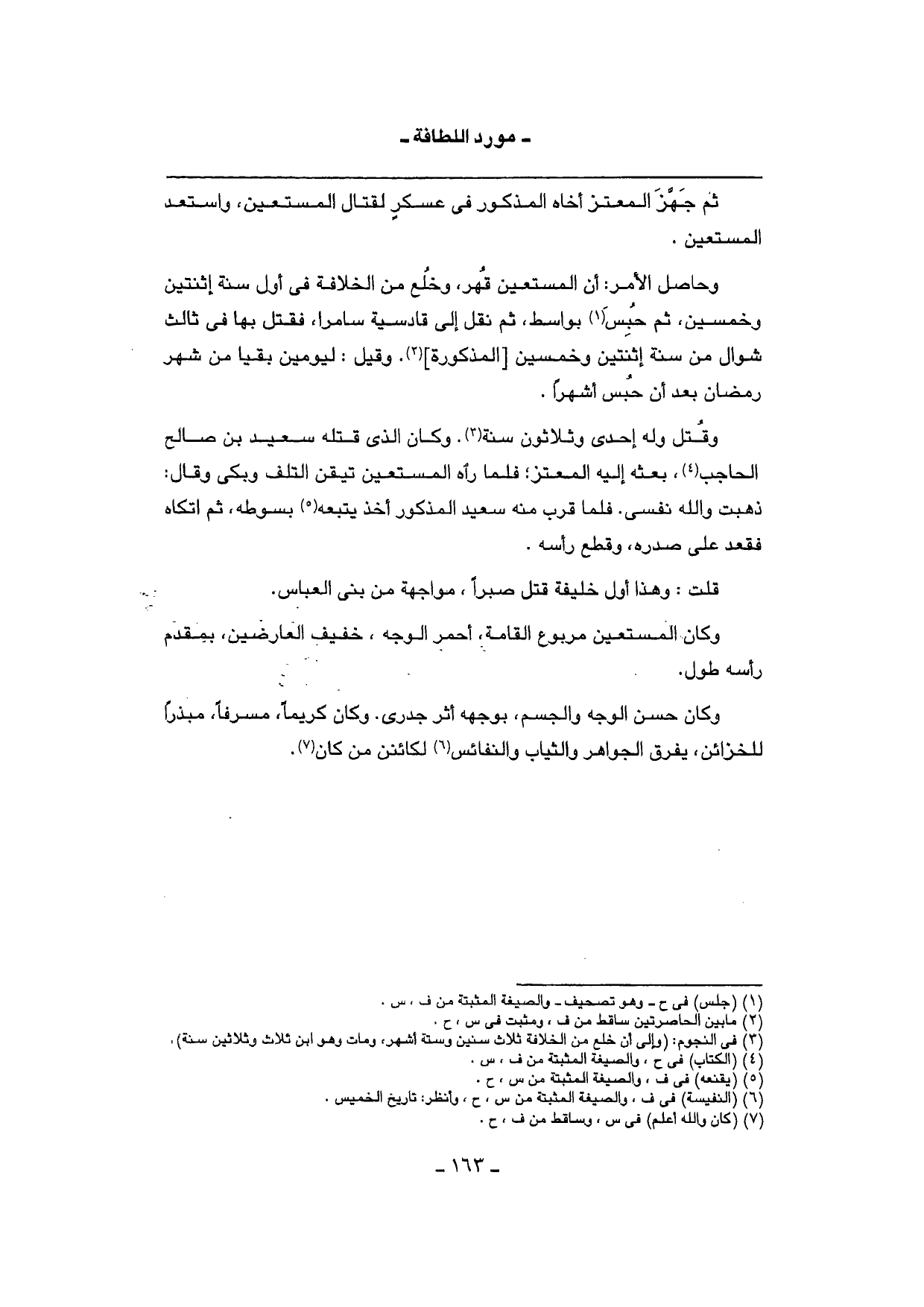 وَحَاصِل الْأَمر: أَن المستعين قهر، وخلع من الْخلَافَة فِي أول سنة إثنتين وَخمسين، ثمَّ حبس بواسط، ثمَّ نقل إِلَى قادسية سامرا، فَقتل بهَا فِي ثَالِث شَوَّال من سنة إثنتين وَخمسين [الْمَذْكُورَة] . وَقيل: ليومين بقيا من شهر رَمَضَان بعد أَن حبس أشهرا.