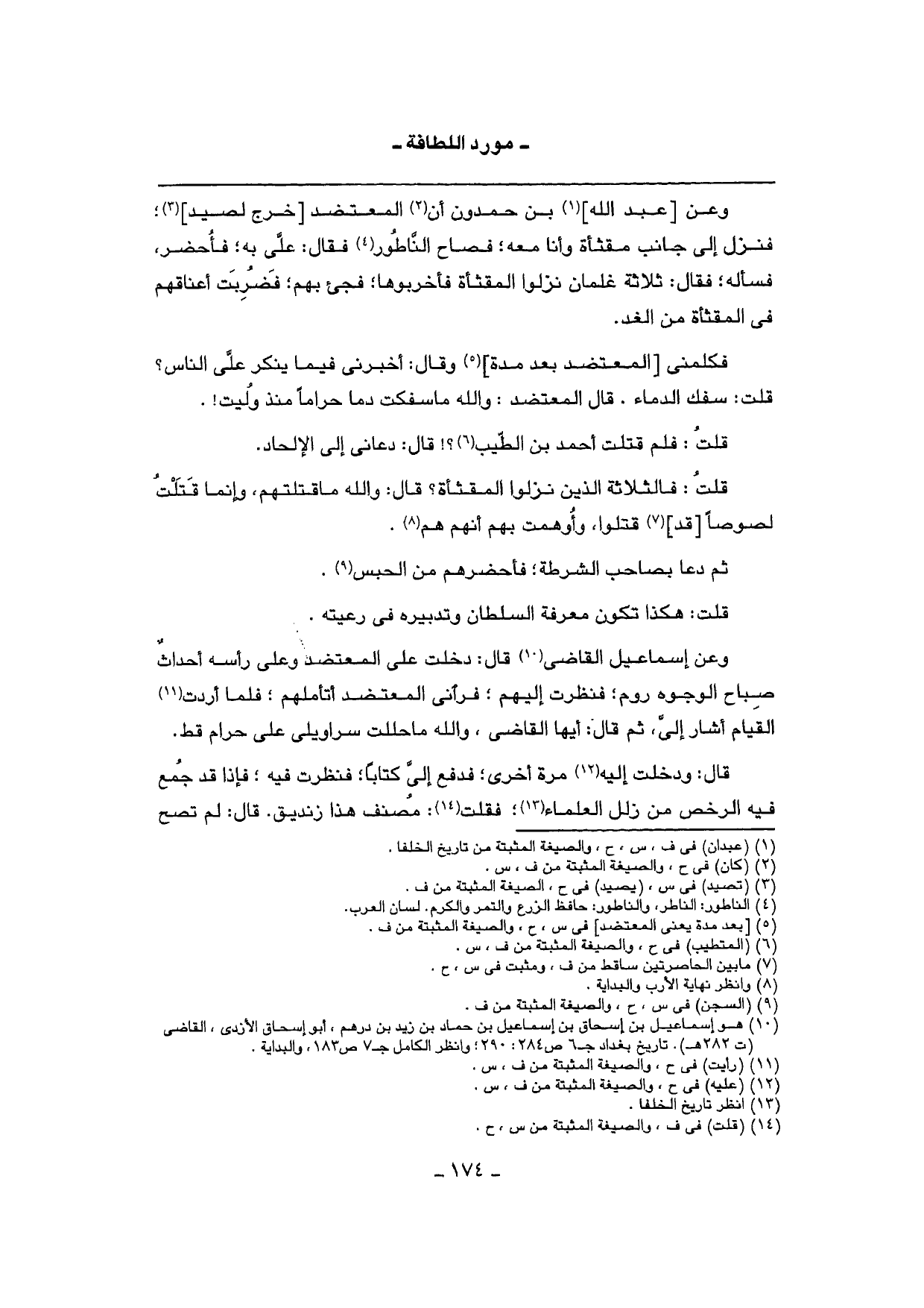 فكلمني [المعتضد بعد مُدَّة] وَقَالَ: أَخْبرنِي فِيمَا يُنكر عَليّ النَّاس؟ قلت: سفك الدِّمَاء. قَالَ المعتضد: وَالله مَا سفكت دَمًا حَرَامًا مُنْذُ وليت {.