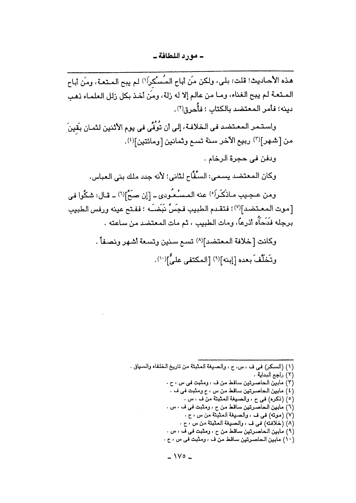 هَذِه الْأَحَادِيث؛ قلت: بلَى، وَلَكِن من أَبَاحَ الْمُسكر لم يبح الْمُتْعَة، وَمن أَبَاحَ الْمُتْعَة لم يبح الْغناء، وَمَا من عَالم إِلَّا لَهُ زلَّة، وَمن أَخذ بِكُل زلل الْعلمَاء ذهب دينه؛ فَأمر المعتضد بِالْكتاب؛ فَأحرق.