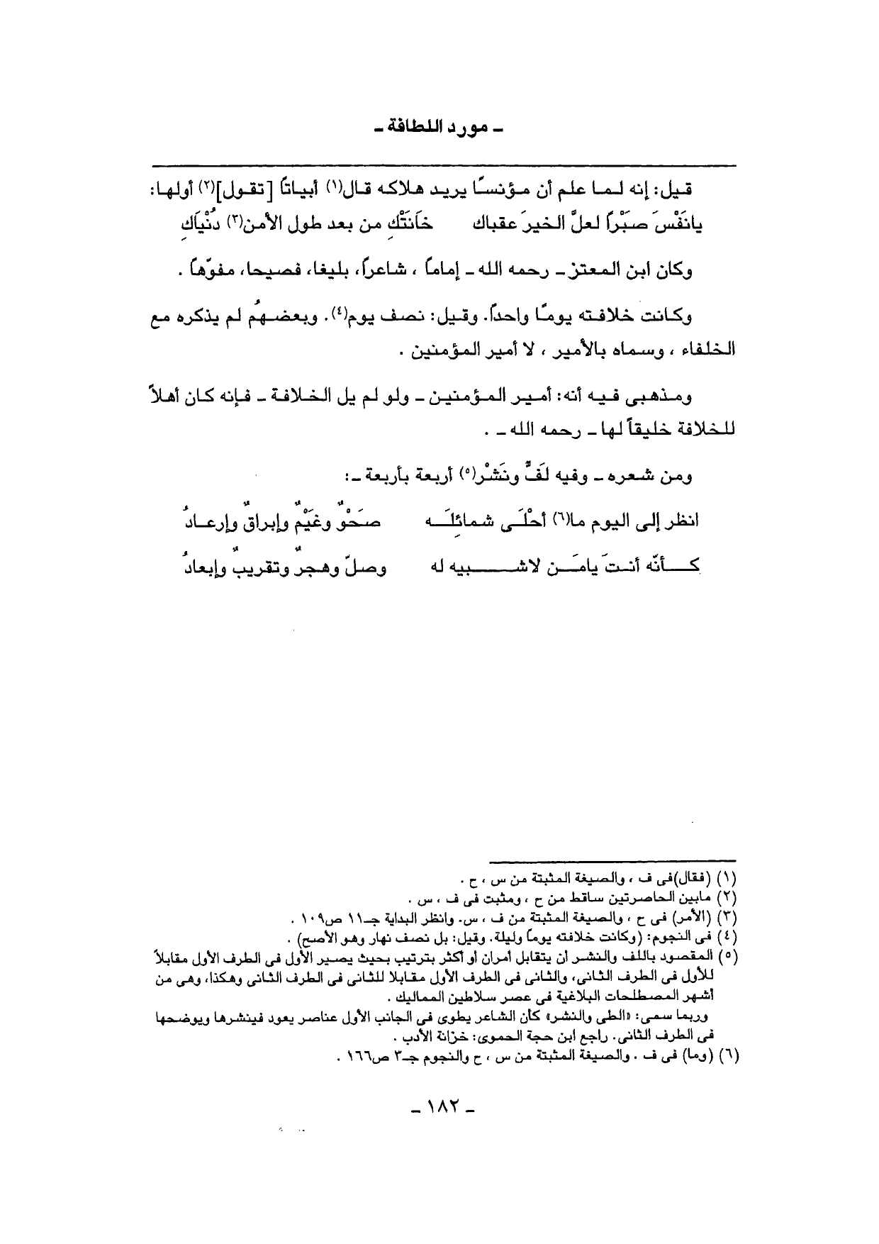 قيل: إِنَّه لما علم أَن مؤنسا يُرِيد هَلَاكه قَالَ أبياتا [تَقول] أَولهَا: