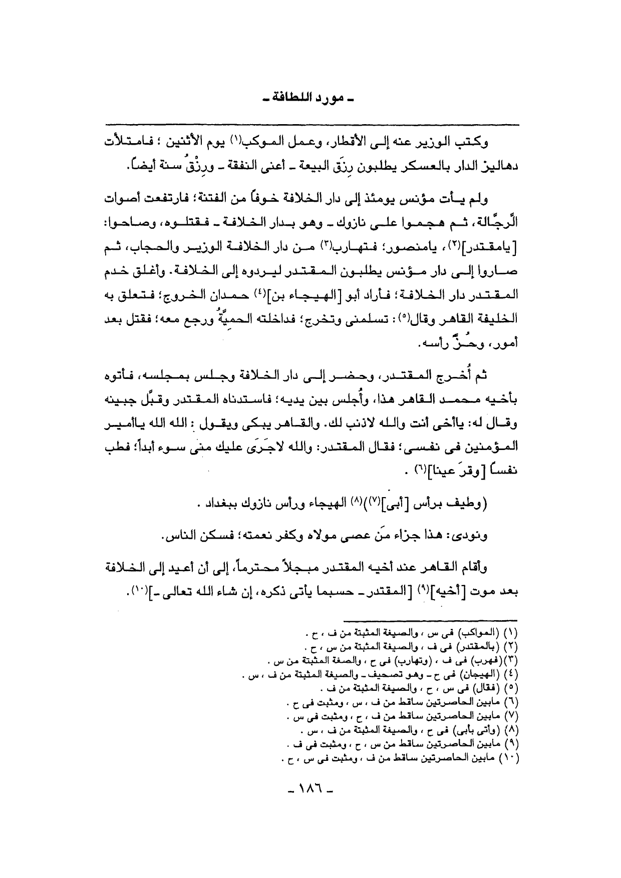 وَلم يَأْتِ مؤنس يَوْمئِذٍ إِلَى دَار الْخلَافَة خوفًا من الْفِتْنَة؛ فارتفعت أصوات الرجالة، ثمَّ هجموا على نازوك - وَهُوَ بدار الْخلَافَة - فَقَتَلُوهُ، وصاحوا: [يَا مقتدر] ، يَا مَنْصُور؛ فتهارب من دَار الْخلَافَة الْوَزير والحجاب، ثمَّ صَارُوا إِلَى دَار مؤنس يطْلبُونَ المقتدر ليردوه إِلَى الْخلَافَة. وأغلق خدم المقتدر دَار الْخلَافَة؛ فَأَرَادَ أَبُو [الهيجاء بن] حمدَان الْخُرُوج؛ فَتعلق بِهِ الْخَلِيفَة القاهر وَقَالَ: تسلمني وَتخرج؛ فداخلته الحمية وَرجع مَعَه؛ فَقتل بعد أُمُور، وحز رَأسه.