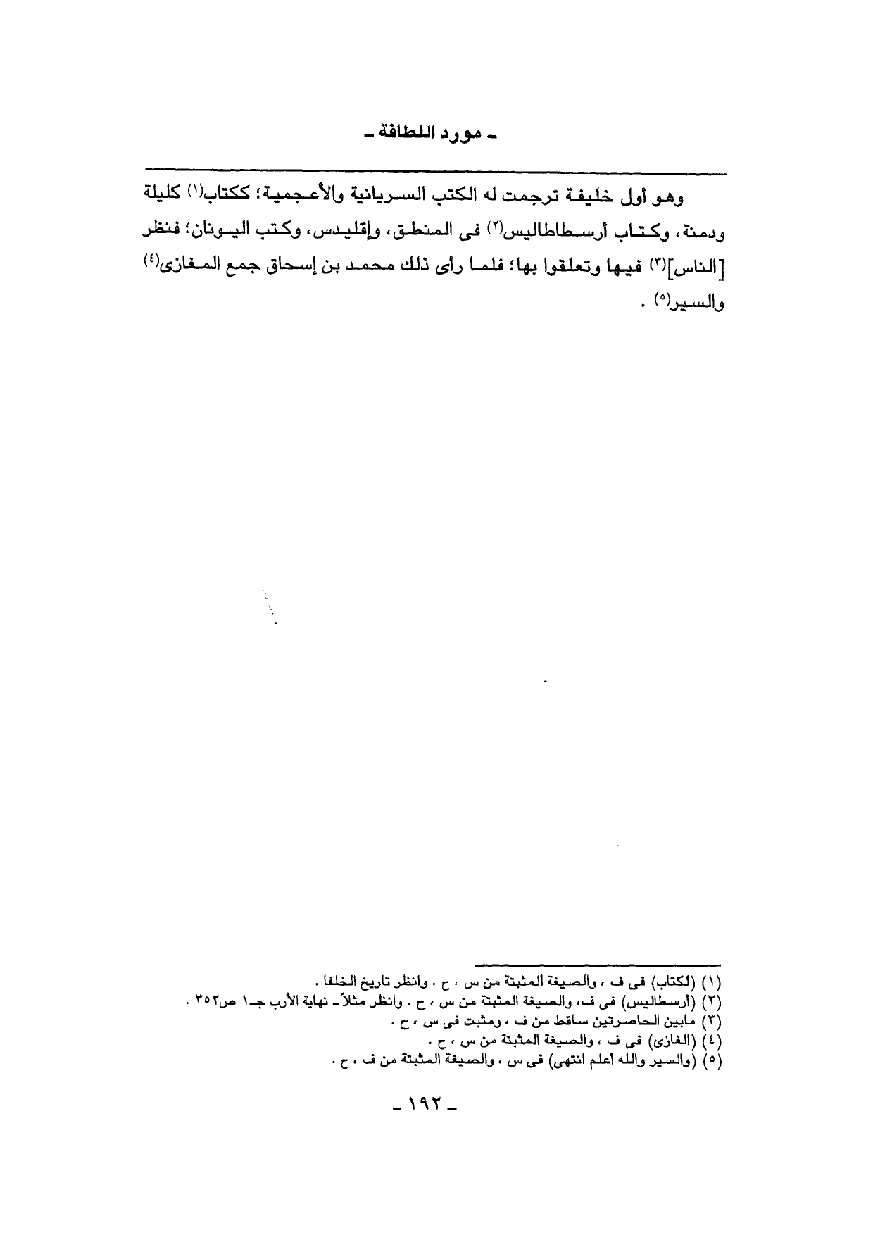 وَهُوَ أول خَليفَة ترجمت لَهُ الْكتب السريانية والأعجمية؛ ككتاب كليلة ودمنة، وَكتاب أرسطاطاليس فِي الْمنطق، وإقليدس، وَكتب اليونان؛ فَنظر [النَّاس] فِيهَا وتعلقوا بهَا؛ فَلَمَّا رأى ذَلِك مُحَمَّد بن إِسْحَاق جمع الْمَغَازِي وَالسير.