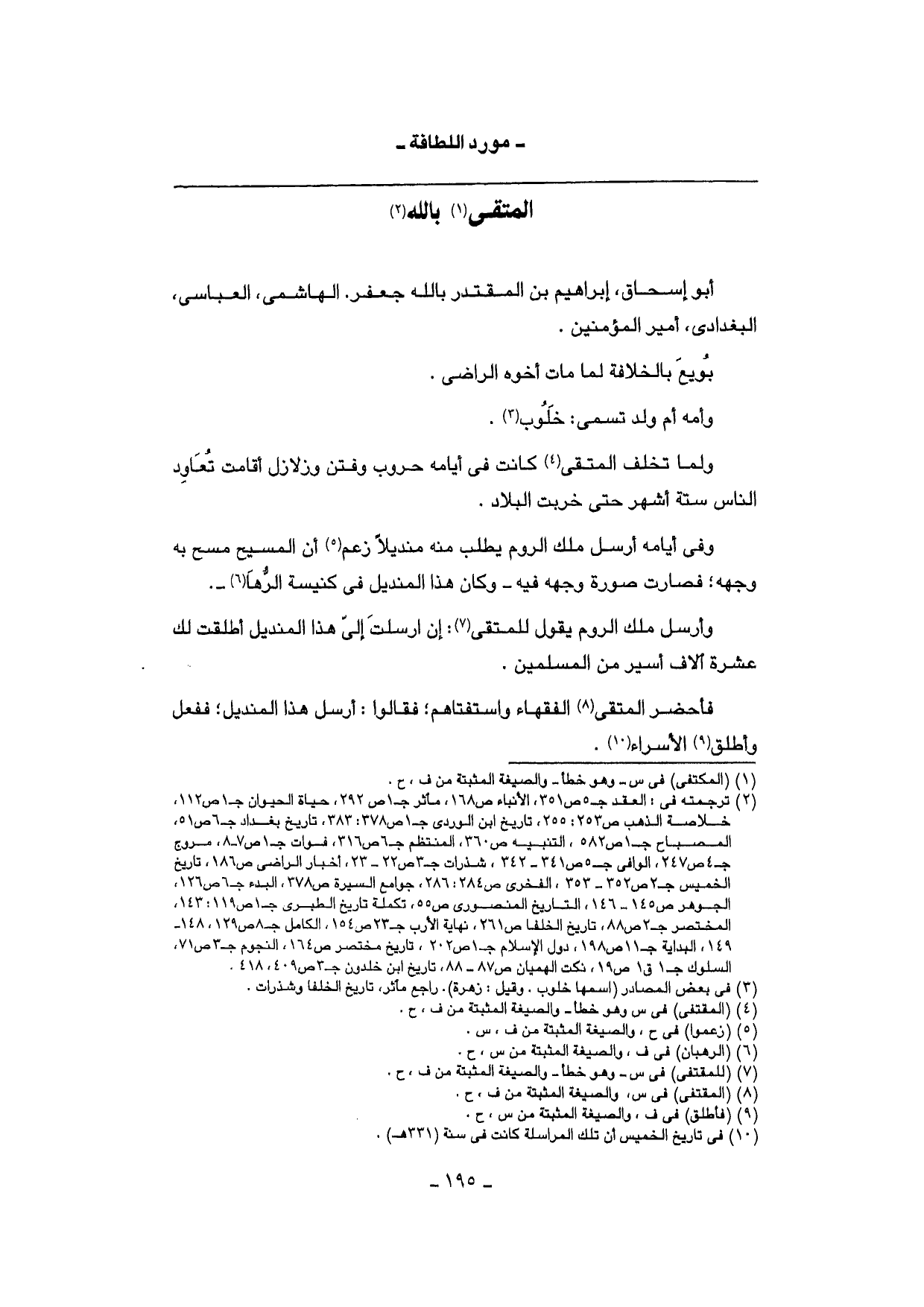 وَأرْسل ملك الرّوم يَقُول للمتقي: إِن أرْسلت إِلَيّ هَذَا المنديل أطلقت لَك عشرَة آلَاف أَسِير من الْمُسلمين.