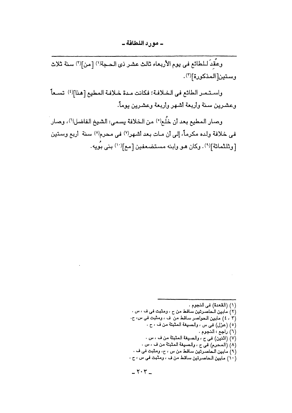 وَصَارَ الْمُطِيع بعد أَن خلع من الْخلَافَة يُسمى: الشَّيْخ الْفَاضِل، وَصَارَ فِي خلَافَة وَلَده مكرما، إِلَى أَن مَاتَ بعد أشهر فِي محرم سنة أَربع وَسِتِّينَ [وثلثمائة] . وَكَانَ هُوَ وَابْنه مستضعفين [مَعَ] بني بويه.