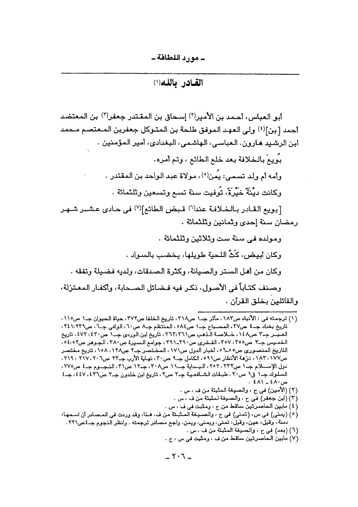 [بُويِعَ الْقَادِر بالخلافة عِنْد قبض الطائع] فِي حادي عشر شهر رَمَضَان سنة إِحْدَى وَثَمَانِينَ وثلثمائة.
