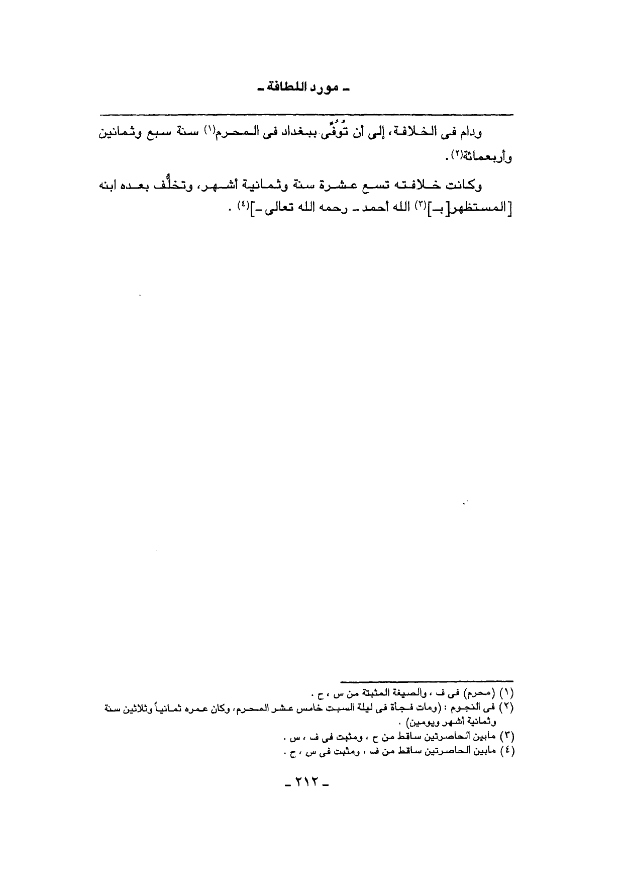 وَكَانَت خِلَافَته تسع عشرَة سنة وَثَمَانِية أشهر، وتخلف بعده ابْنه [المستظهر [ب] الله أَحْمد - رَحمَه الله تَعَالَى -] .
