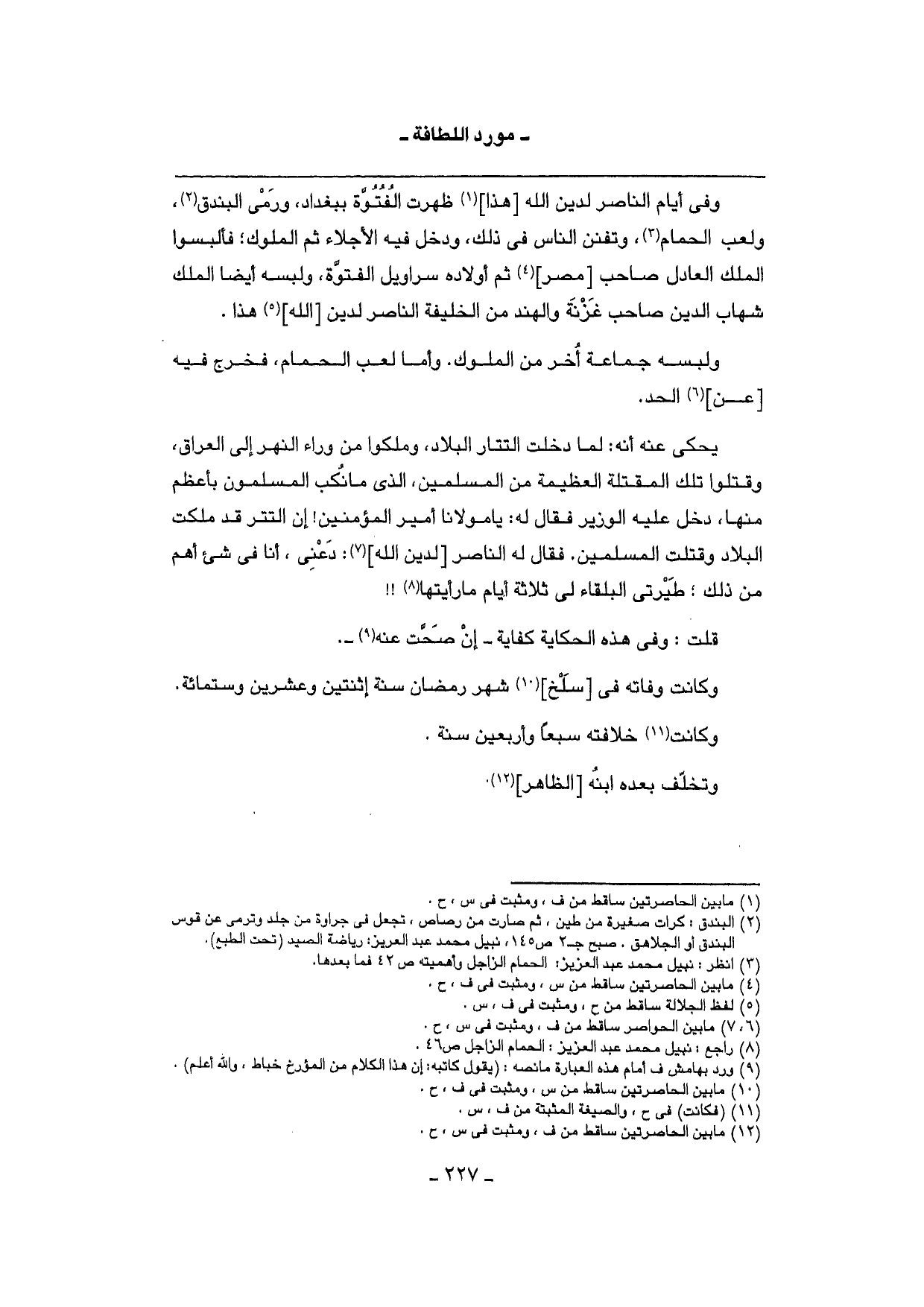 وَفِي أَيَّام النَّاصِر لدين الله [هَذَا] ظَهرت الفتوة بَغْدَاد، وَرمي البندق، وَلعب الْحمام، وتفنن النَّاس فِي ذَلِك، وَدخل فِيهِ الأجلاء ثمَّ الْمُلُوك؛ فألبسوا الْملك الْعَادِل صَاحب [مصر] ثمَّ أَوْلَاده سَرَاوِيل الفتوة، ولبسه أَيْضا الْملك شهَاب الدّين صَاحب غزنة والهند من الْخَلِيفَة النَّاصِر لدين [الله] هَذَا.