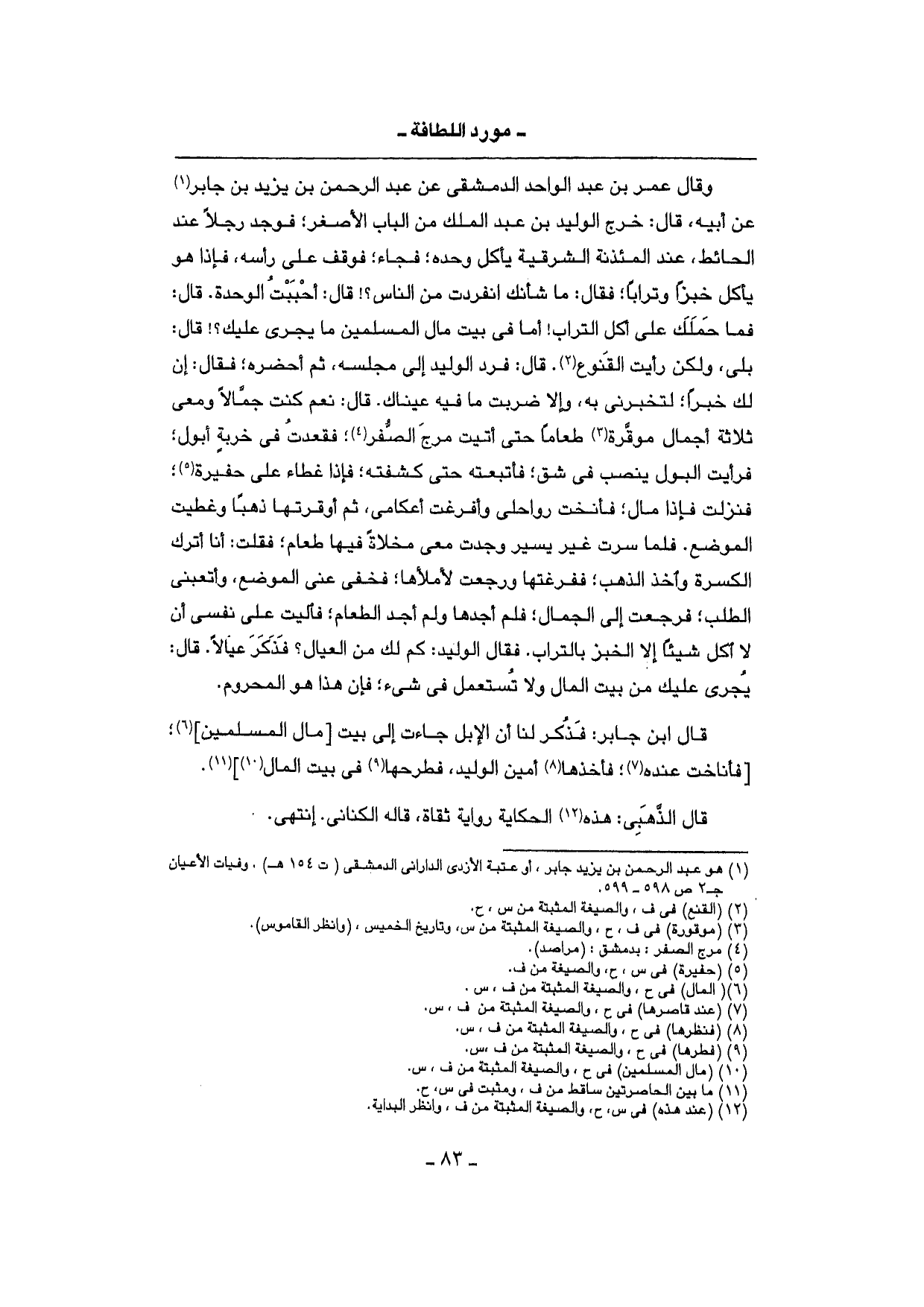 وَقَالَ عمر بن عبد الْوَاحِد الدِّمَشْقِي عَن عبد الرَّحْمَن بن يزِيد بن جَابر عَن أَبِيه، قَالَ: خرج الْوَلِيد بن عبد الْملك من الْبَاب الْأَصْغَر؛ فَوجدَ رجلا عِنْد الْحَائِط، عِنْد المئذنة الشرقية يَأْكُل وَحده؛ فجَاء؛ فَوقف على رَأسه، فَإِذا هُوَ يَأْكُل خبْزًا وترابا؛ فَقَالَ: مَا شَأْنك انْفَرَدت من النَّاس؟ {قَالَ: أَحْبَبْت الْوحدَة. قَالَ: فَمَا حملك على أكل التُّرَاب} أما فِي بَيت مَال الْمُسلمين مَا يجْرِي عَلَيْك؟ ! قَالَ: بلَى، وَلَكِن رَأَيْت القنوع. قَالَ: فَرد الْوَلِيد إِلَى مَجْلِسه، ثمَّ أحضرهُ؛ فَقَالَ: إِن لَك خَبرا؛ لتخبرني بِهِ، وَإِلَّا ضربت مَا فِيهِ عَيْنَاك. قَالَ: نعم كنت جمالا وَمَعِي ثَلَاثَة أجمال موقرة طَعَاما حَتَّى أتيت مرج الصفر؛ فَقَعَدت فِي خربة أبول؛ فَرَأَيْت الْبَوْل ينصب فِي شقّ؛ فَأَتْبَعته حَتَّى كشفته؛ فَإِذا غطاء على حفيرة؛ فَنزلت فَإِذا مَال؛ فأنخت رواحلي وأفرغت أعكامي، ثمَّ أوقرتها ذَهَبا وغطيت الْموضع. فَلَمَّا سرت غير يسير وجدت معي مخلاة فِيهَا طَعَام؛ فَقلت: أَنا أترك الكسرة وآخذ الذَّهَب؛ ففرغتها وَرجعت لأملأها؛ فخفي عني الْموضع، وأتعبني الطّلب؛ فَرَجَعت إِلَى الْجمال؛ فَلم أَجدهَا وَلم أجد الطَّعَام؛ فآليت على نَفسِي أَن لَا آكل شيئ إِلَّا الْخبز بِالتُّرَابِ. فَقَالَ الْوَلِيد: كم لَك من الْعِيَال؟ فَذكر عيالا. قَالَ: يجْرِي عَلَيْك من بَيت المَال وَلَا تسْتَعْمل فِي شَيْئا؛ فَإِن هَذَا هُوَ المحروم.