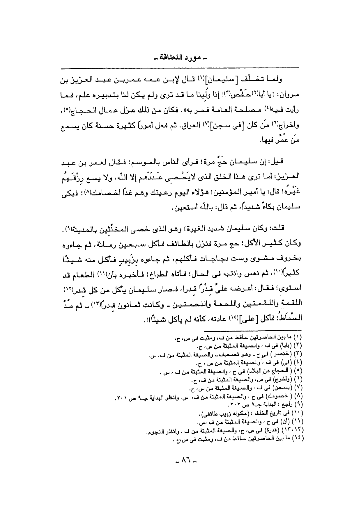 وَكَانَ كثير الْأكل؛ حج مرّة فَنزل بِالطَّائِف فَأكل سبعين رمانة، ثمَّ جَاءُوهُ بخروف مشوي وست دجاجات فأكلهم، ثمَّ جَاءُوهُ بزبيب فَأكل مِنْهُ شَيْئا كثيرا، ثمَّ نعس وانتبه فِي الْحَال؛ فَأَتَاهُ الطباخ؛ فَأخْبرهُ بِأَن الطَّعَام قد اسْتَوَى؛ فَقَالَ: أعرضه عَليّ قدرا قدرا، فَصَارَ سُلَيْمَان يَأْكُل من كل قدر اللُّقْمَة واللقمتين واللحمة واللحمتين - وَكَانَت ثَمَانُون قدرا - ثمَّ مد السماط؛ فَأكل [على] عَادَته، كَأَنَّهُ لم يَأْكُل شَيْئا} {} .